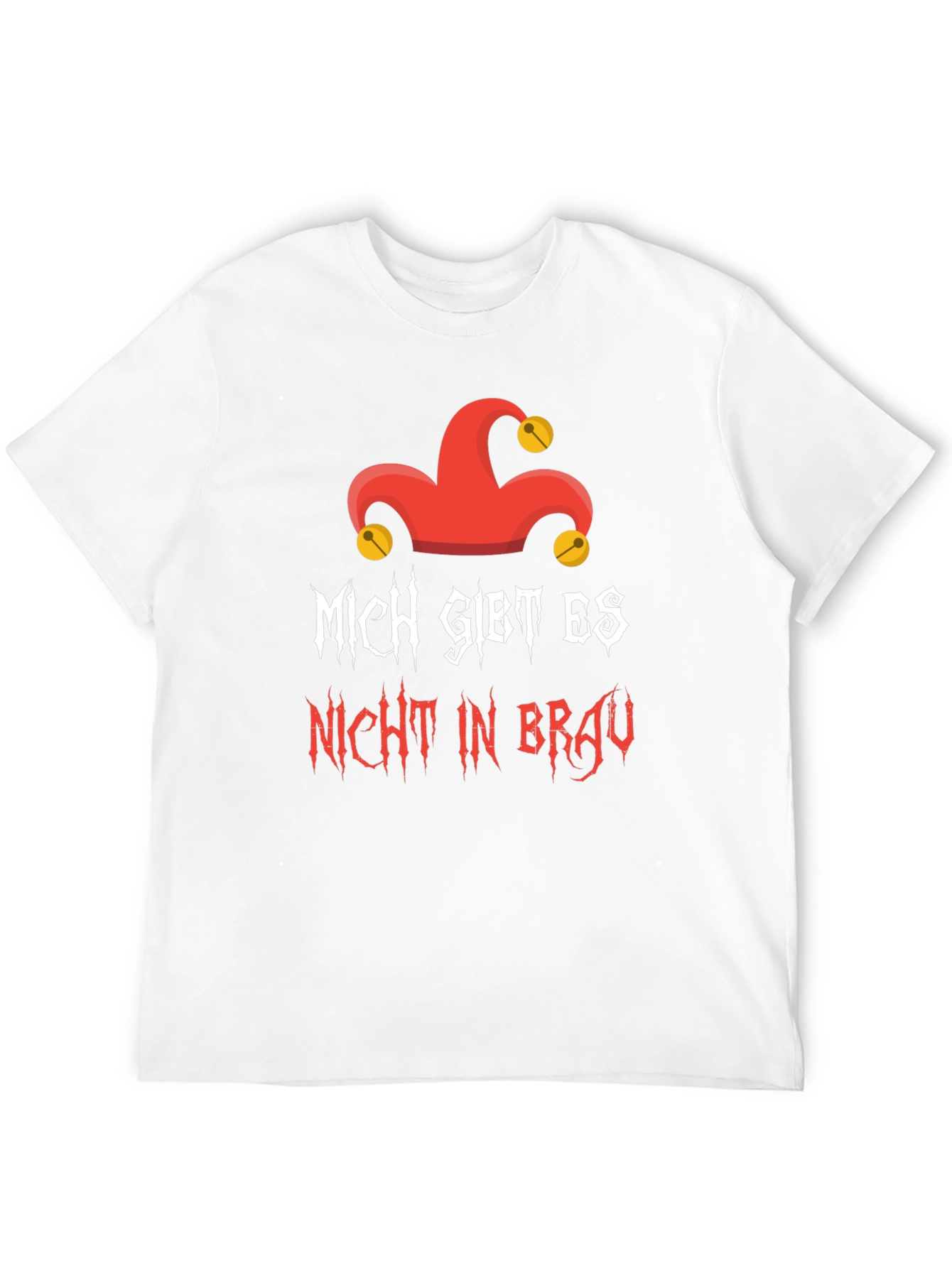 This black t-shirt features a unique and playful graphic design. A red jester hat with bells sits above bold lettering that reads 'Mich Gibt Es Nicht In Brau.' The text is split between two different fonts, with the first line in a clean, gothic style and the second in a striking red. Made from a comfortable-looking fabric, this shirt is perfect for casual wear, themed parties, or anyone with a quirky sense of humor. Show off your fun side with this eye-catching statement tee.