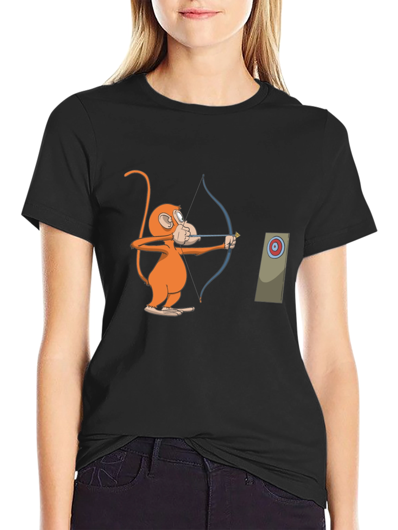 Show off your unique style with this eye-catching black cotton t-shirt. This tee features a fun and quirky graphic of a cartoon monkey skillfully aiming a bow and arrow at a target. The design is playful and sure to spark conversation. Made from comfortable, breathable cotton, it's perfect for everyday wear. Pair it with jeans or shorts for a casual yet cool look. Great for monkey lovers, archery enthusiasts, or anyone who appreciates a fun, distinctive design. A must-have addition to your wardrobe!