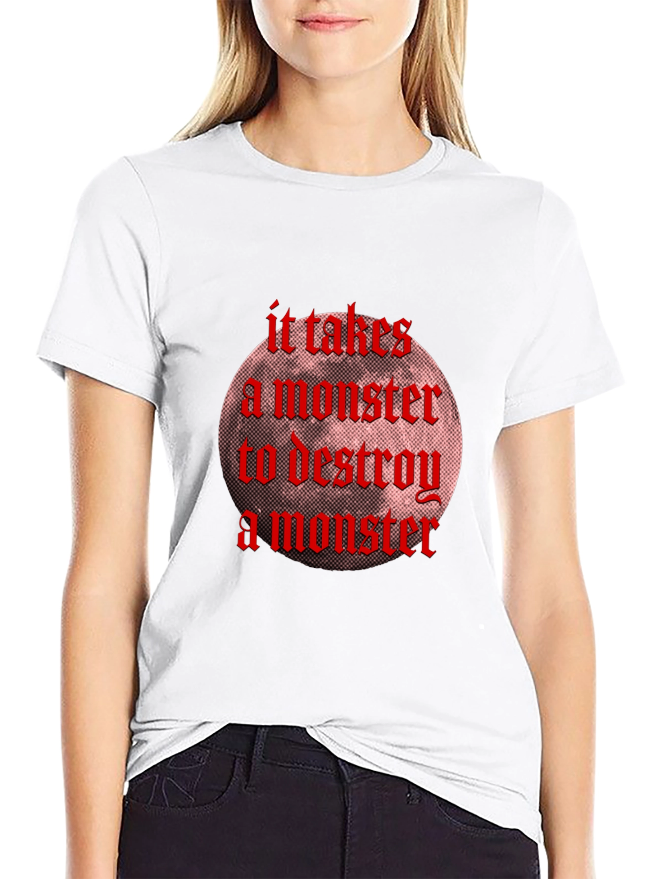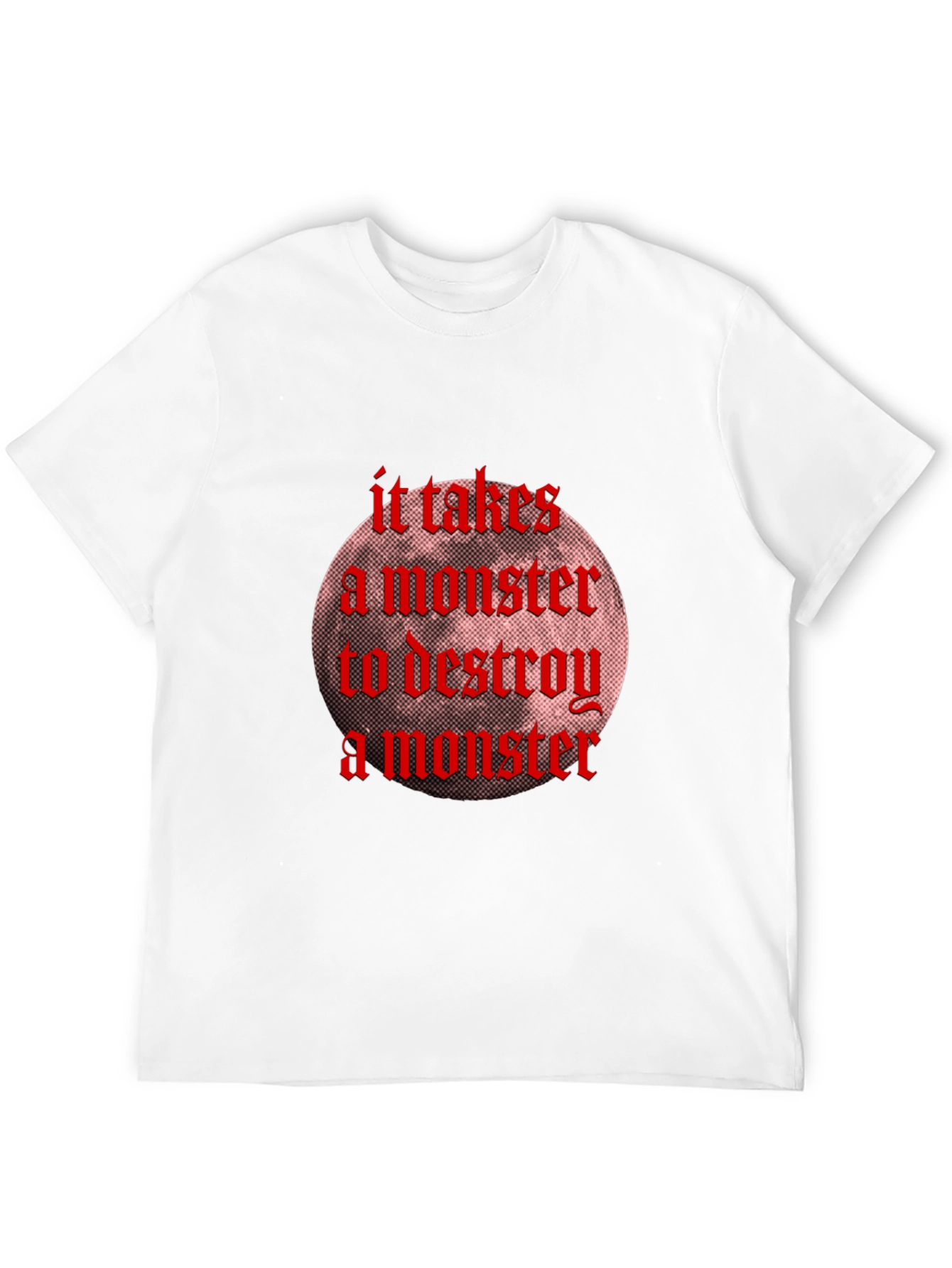 Show off your edgy style with this black t-shirt featuring a bold graphic print. The design displays the phrase "It takes a monster to destroy a monster" in gothic red font over a full moon backdrop. Crafted from a comfortable, soft fabric, this short-sleeved tee offers a relaxed fit that's perfect for everyday wear. This standout shirt is ideal for casual outings, concerts, or making a statement. Pair it with jeans, shorts, or layer it under a jacket for a versatile look.