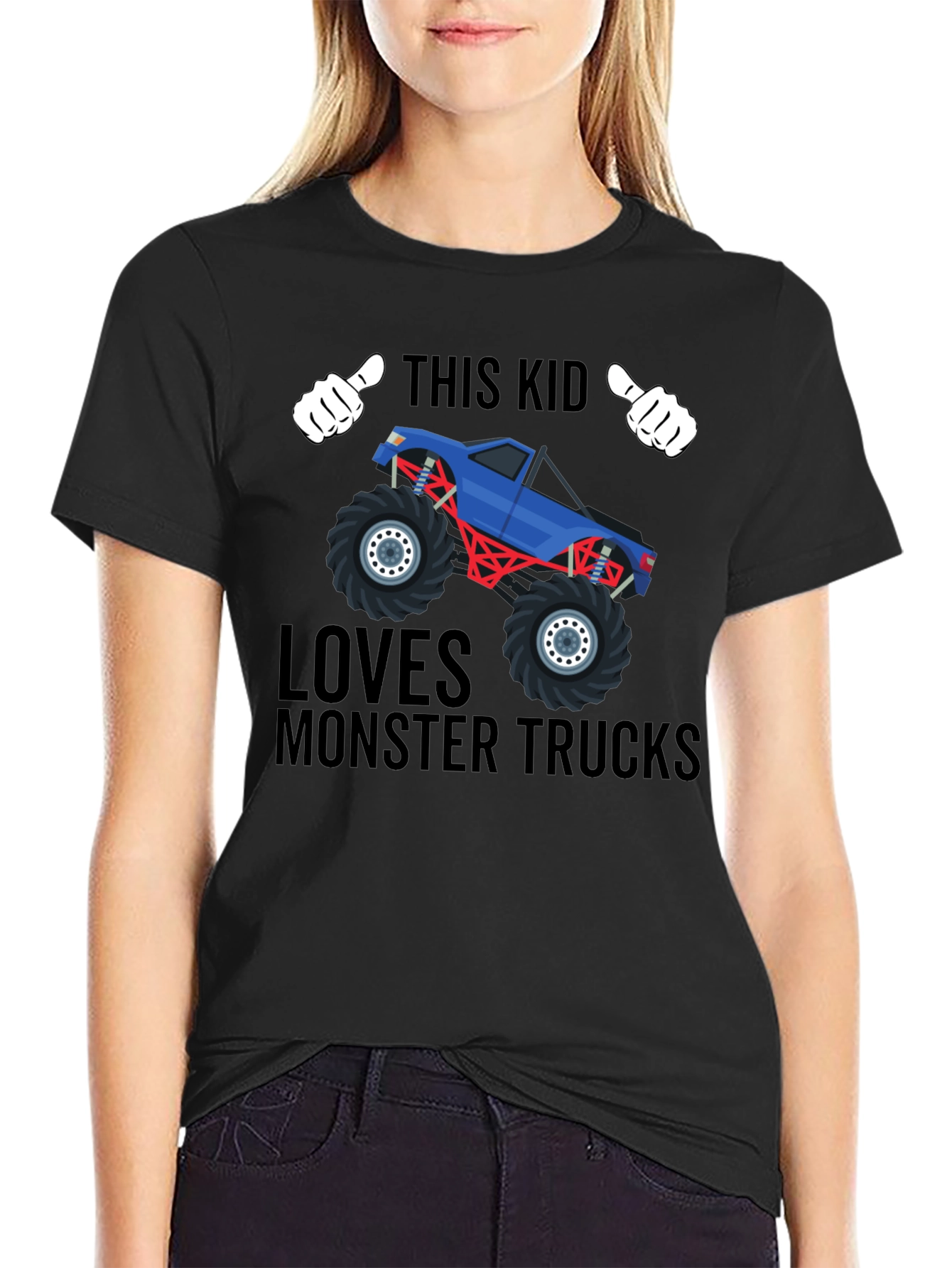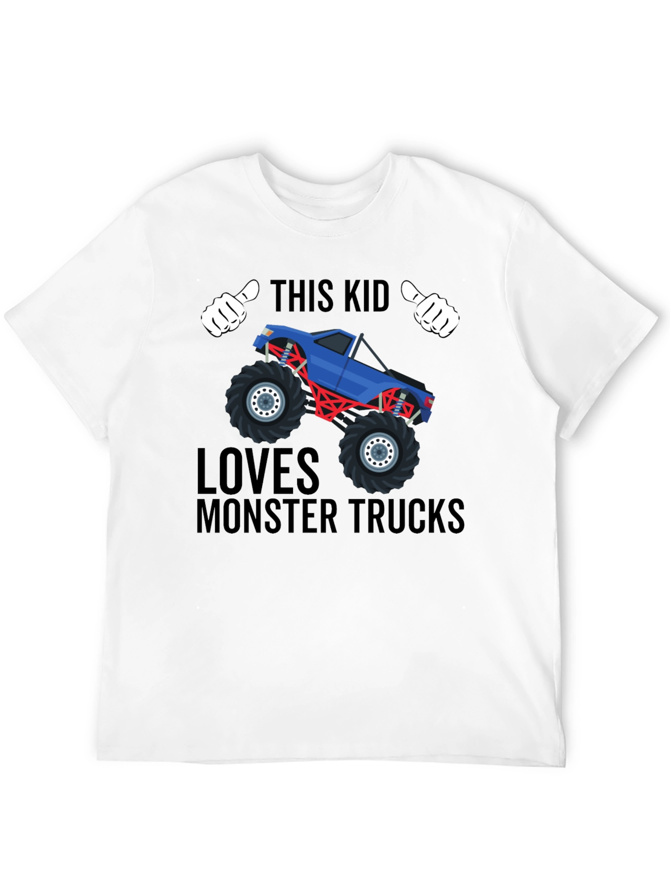 This cool black t-shirt features a blue monster truck illustration. The design includes cartoon hands giving a thumbs up above the truck. The text 'THIS KID LOVES MONSTER TRUCKS' surrounds the vehicle. This is perfect for children who adore monster trucks and everything about them. The shirt appears to be made of comfortable, breathable fabric, making it ideal for everyday wear. Great for playdates, casual outings, or as a fun gift for monster truck enthusiasts. Let your child showcase their passion in style with this unique and eye-catching tee!