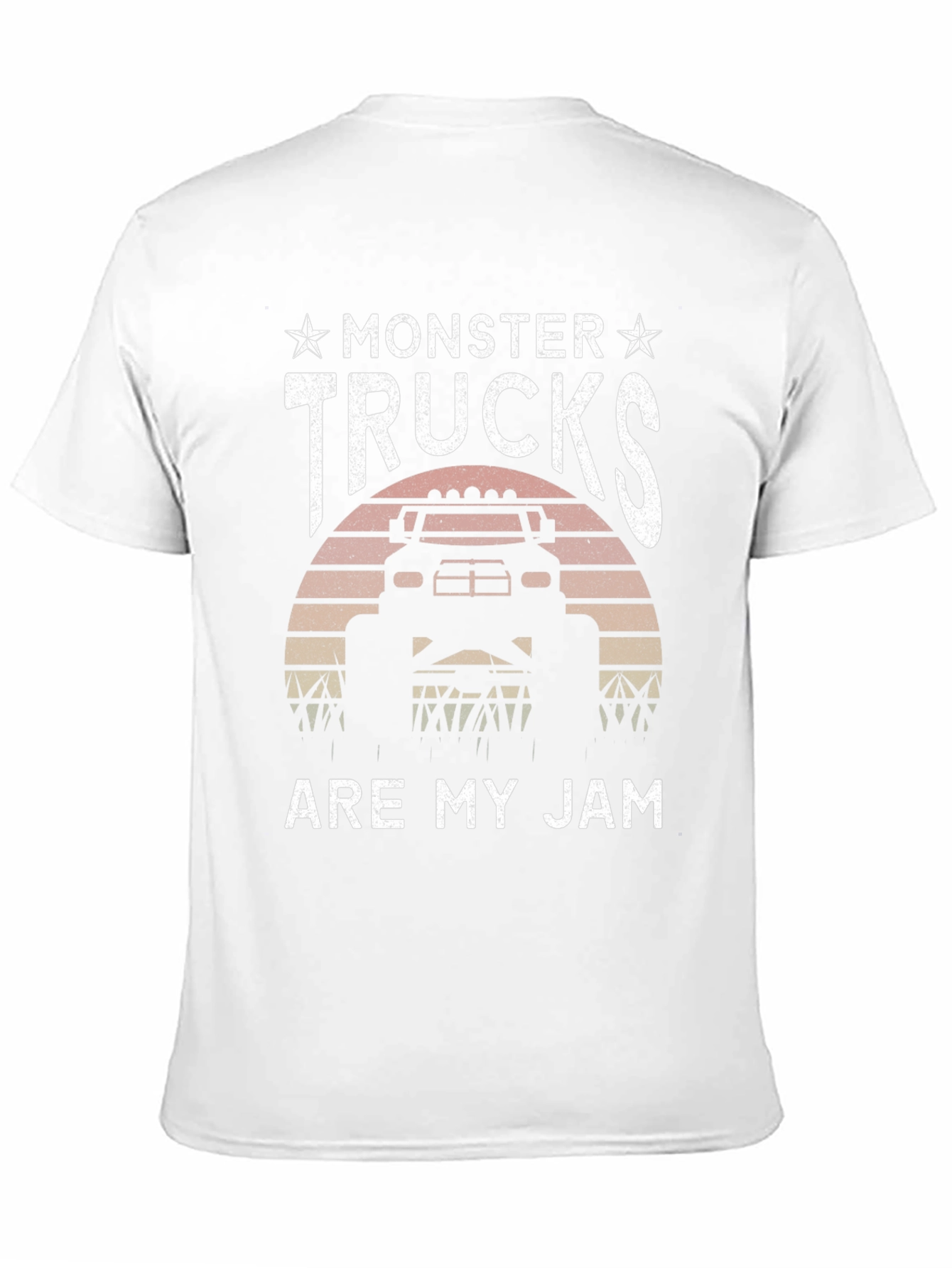 Show off your love for monster trucks with this cool black t-shirt. The tee features a sunset graphic with a monster truck silhouette and the saying "Monster Trucks Are My Jam". Made from a soft, breathable fabric, this shirt is comfortable to wear all day long. It's perfect for casual outings, car shows, or just lounging around. The classic fit and bold design make it a great addition to any wardrobe. Get yours today and let everyone know about your passion for monster trucks!
