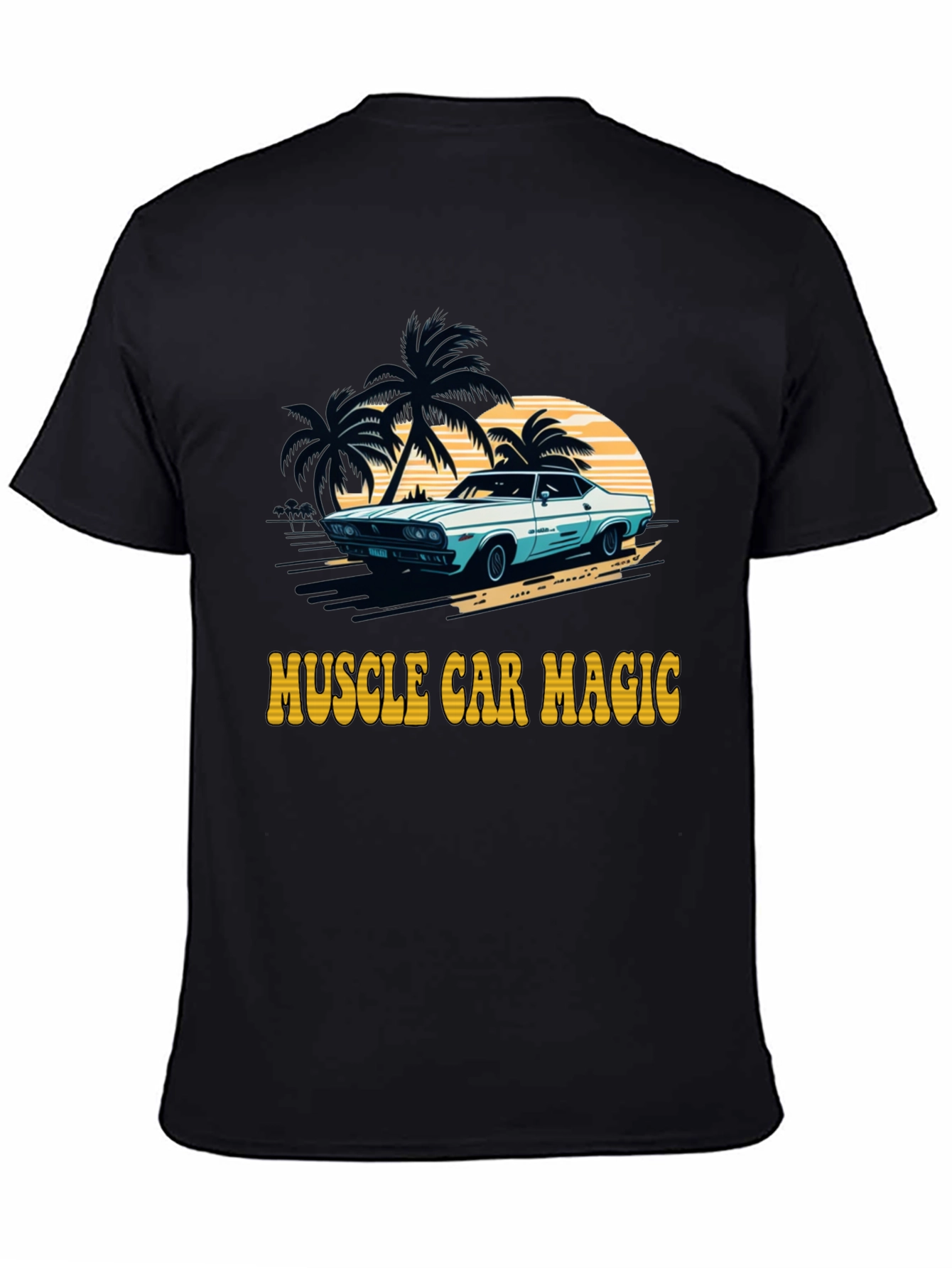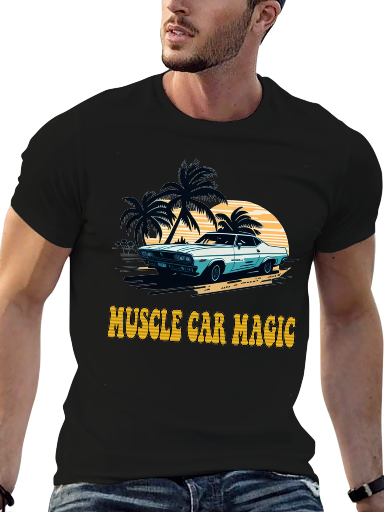 Cruise into style with this black "Muscle Car Magic" T-shirt! The design features a sleek, vintage muscle car parked against a vibrant sunset backdrop with palm trees, evoking a cool, retro vibe. Made from comfortable, breathable fabric, this tee is perfect for casual wear or car shows. Let everyone know you love a classic car by wearing this unique T-shirt. Get yours today and bring a touch of vintage charm to your wardrobe! This cool tee is sure to become a favorite.