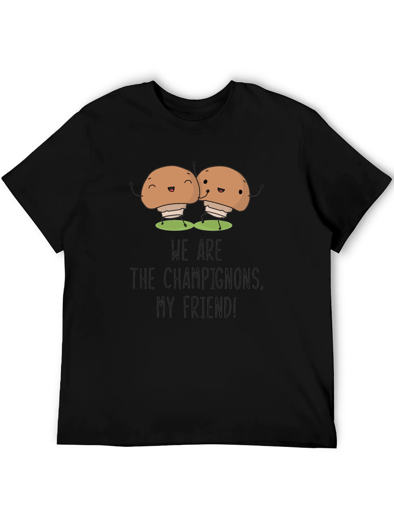 This black t-shirt features an adorable cartoon illustration of two happy mushrooms, complete with smiling faces and waving arms. Positioned above them is the punny text, "WE ARE THE CHAMPIGNONS, MY FRIEND!" making it a fun and playful statement piece. The shirt appears to be made from a soft, comfortable fabric, perfect for everyday wear. Ideal for mushroom enthusiasts, pun lovers, or anyone who appreciates a touch of humor in their wardrobe. It can be paired with jeans, shorts, or skirts for a casual, quirky look. A fantastic gift idea for birthdays, holidays, or just to brighten someone's day with a little bit of fungal fun!