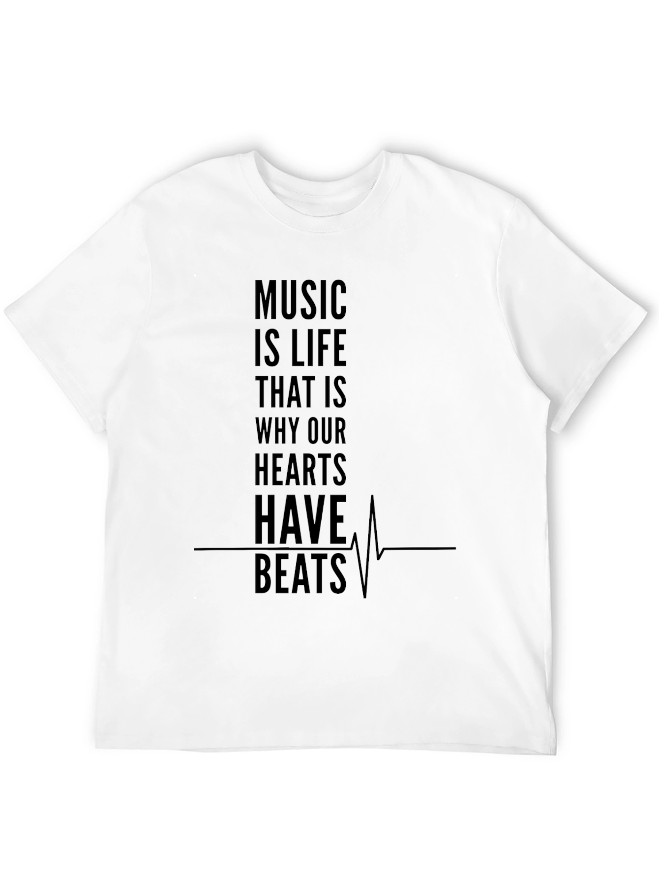 Express your love for music with this stylish black t-shirt. Featuring the phrase 'Music is Life' in a vertically stacked design, followed by 'That is Why Our Hearts Have Beats', this tee is perfect for music lovers. The phrase is complemented by a simple heartbeat line graphic. Made from comfortable fabric, this shirt offers a great fit. Ideal for casual wear, concerts, music festivals, or everyday wear. A statement piece that shows off your passion for music.