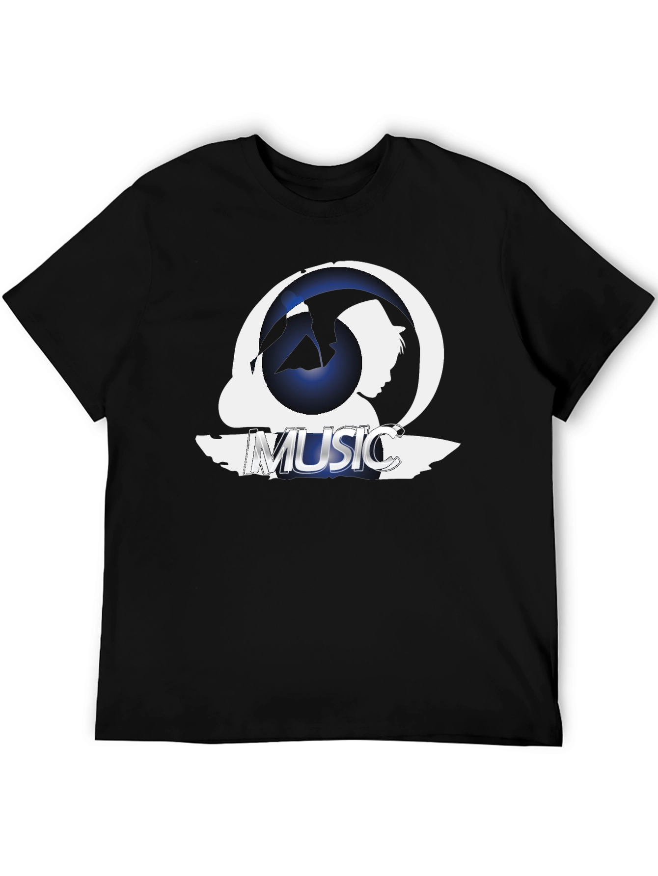 Show your love for music with this stylish black graphic T-shirt! The design features a white silhouette of a person with a hat and musical notes within a circle, set against a dark background with the word "MUSIC" prominently displayed. Made from a comfortable fabric, this tee is perfect for casual wear. Its unique design makes it a great conversation starter. Ideal for music lovers, concerts, or everyday style, this T-shirt is a must-have addition to any wardrobe. Get yours today and wear your passion!