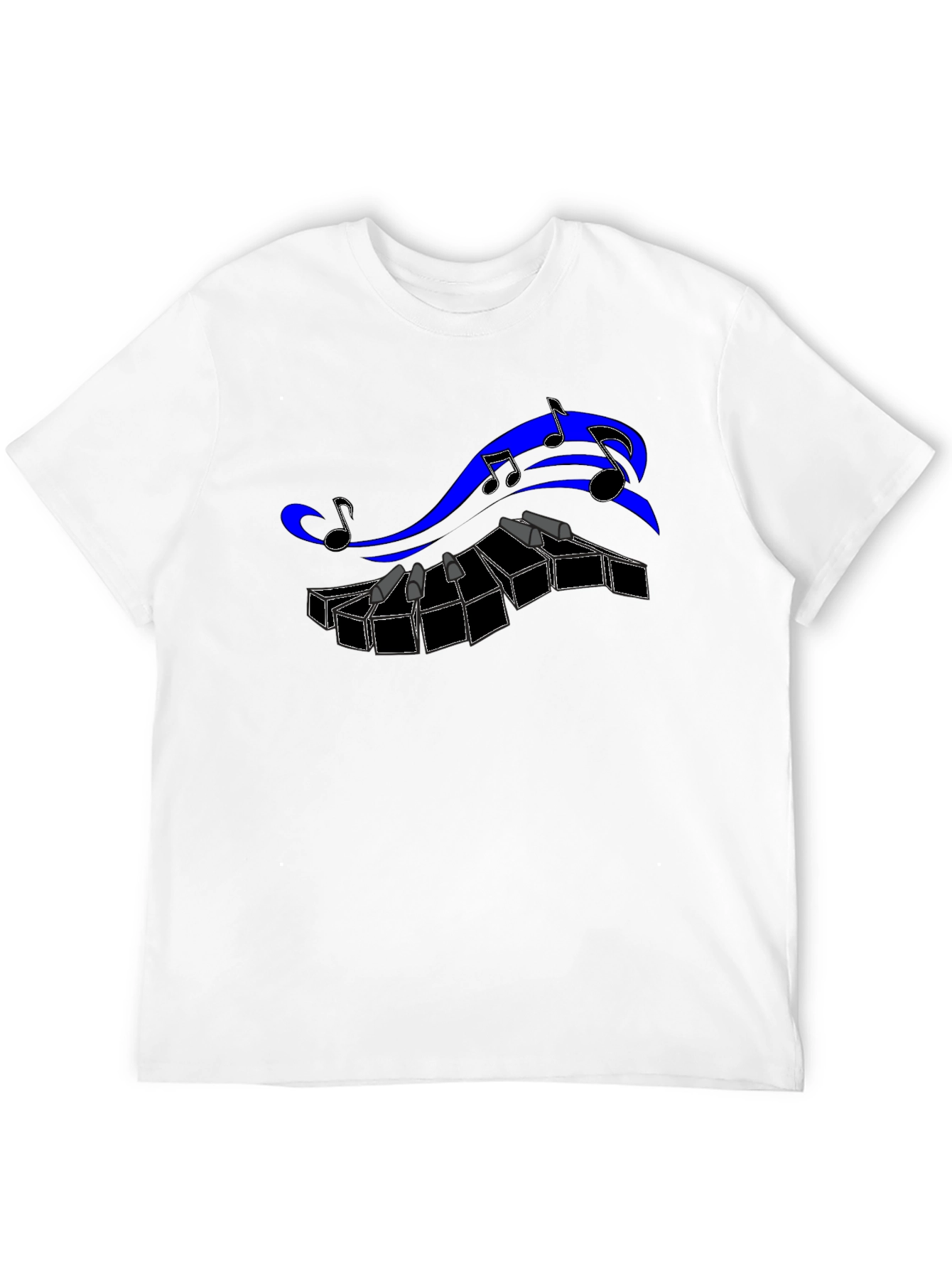 Show off your love for music with this unique black t-shirt. This eye-catching tee features a creative design showcasing a keyboard graphic complemented by stylized blue musical notes. Perfect for musicians, music enthusiasts, or anyone who appreciates artistic apparel. Made from comfortable materials, it's ideal for everyday wear, concerts, music events, or casual outings. A must-have addition to any wardrobe, this t-shirt is sure to turn heads and spark conversations. Express your passion for music in style! Get yours today and let the world know you groove to the beat!