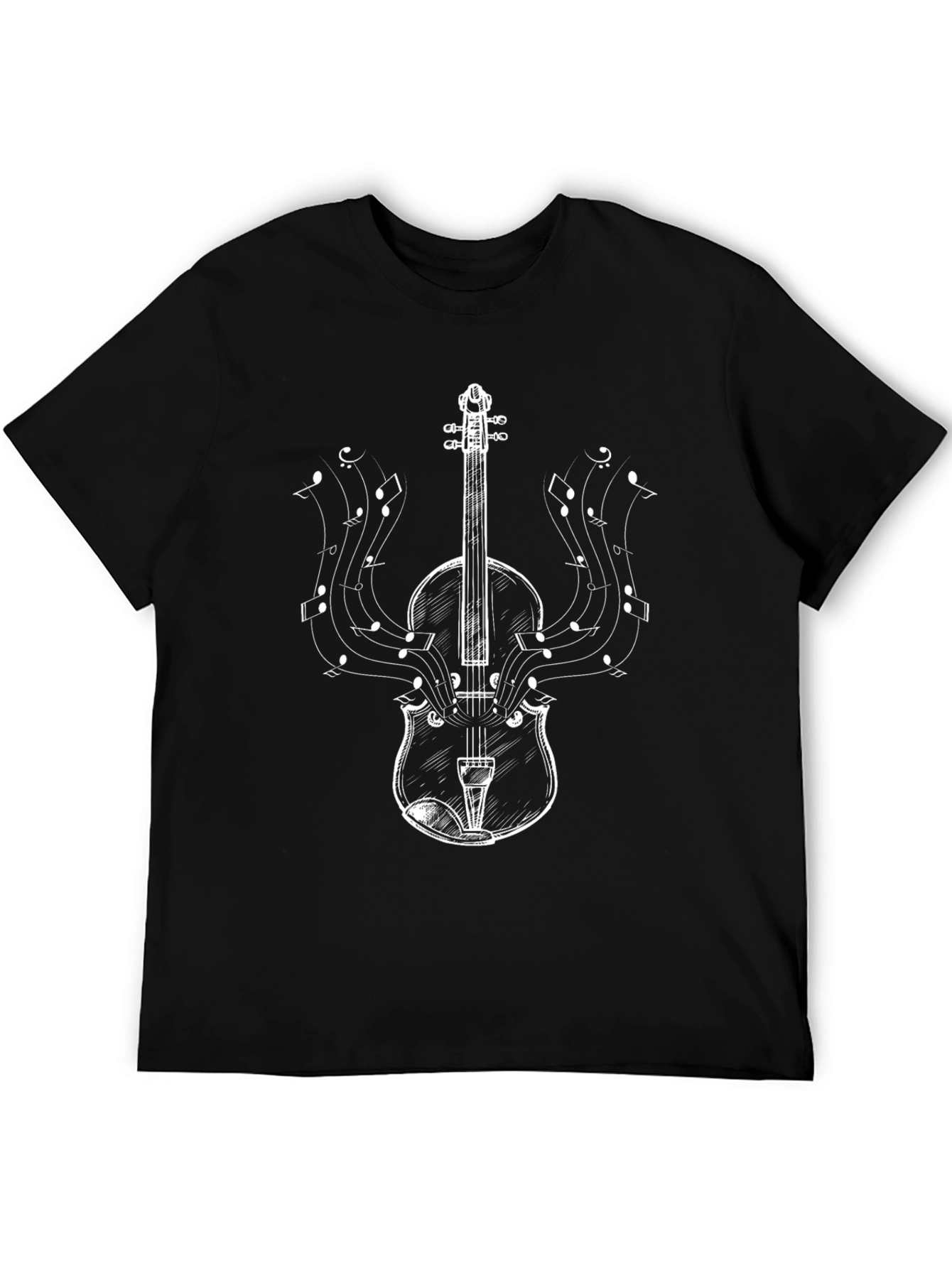 This classic black t-shirt features a unique and artistic graphic design. The centerpiece is a detailed illustration of a violin, creatively surrounded by musical notes that appear to flow from the instrument. Made from a comfortable-looking fabric, this tee is perfect for musicians, music lovers, or anyone who appreciates distinctive apparel. Its versatile style makes it ideal for casual wear, concerts, or music-themed events. Show off your passion for music with this eye-catching and stylish t-shirt.