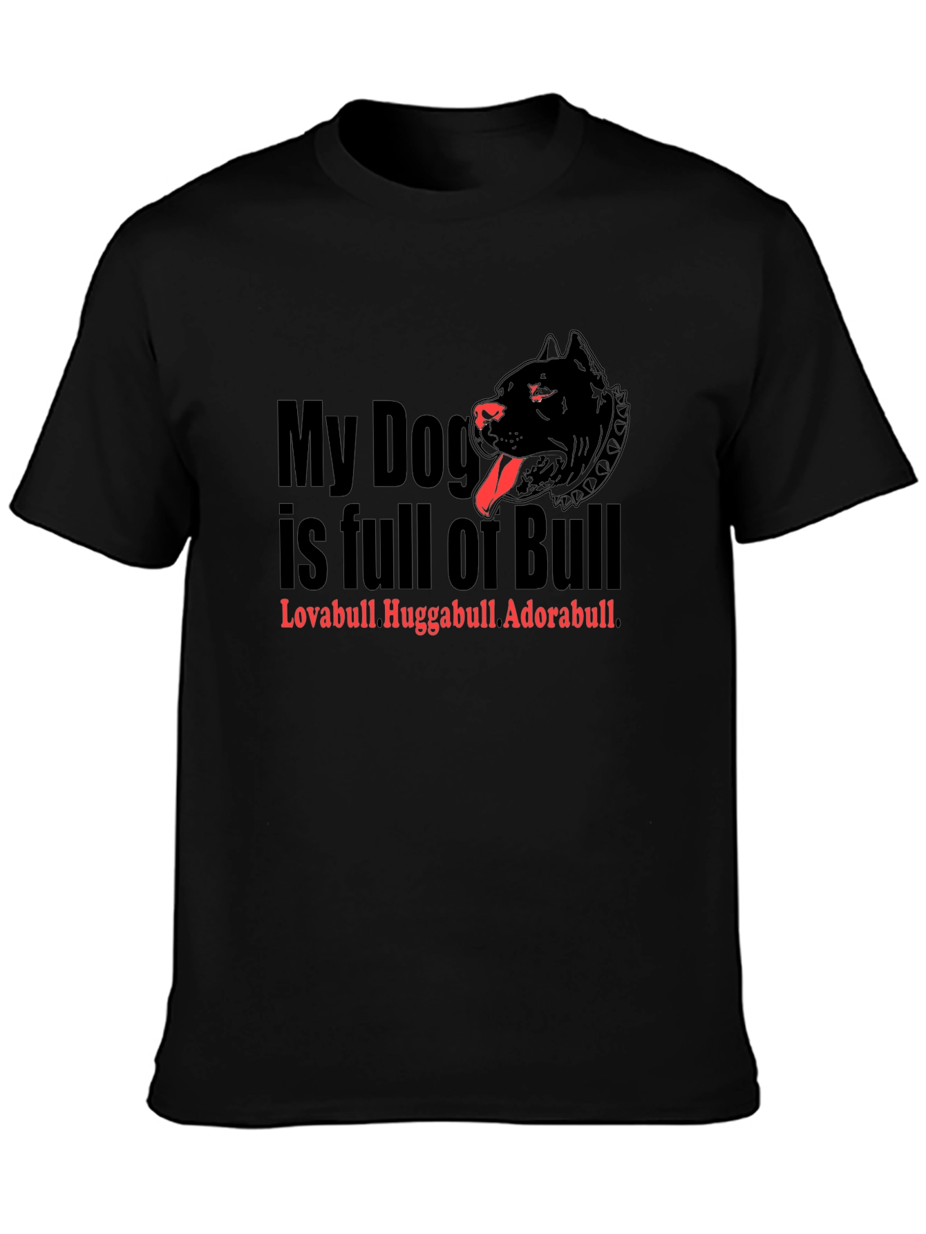 Show off your love for your bully breed with this playful black tee. Featuring a bold design with the phrase "My Dog is Full of Bull" and the words "Lovabull Huggabull Adorabull", this shirt is perfect for any dog lover. A silhouette of a bull dog's head completes the design. Made from comfortable, breathable fabric, this shirt is ideal for everyday wear. Whether you're walking your furry friend or just lounging at home, this tee is a fun way to express your love for your pet.