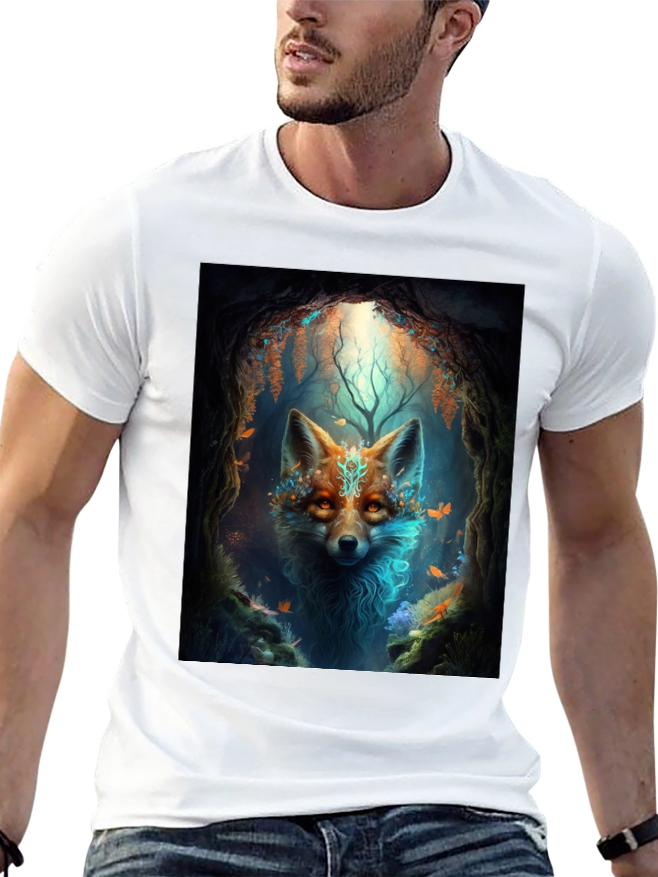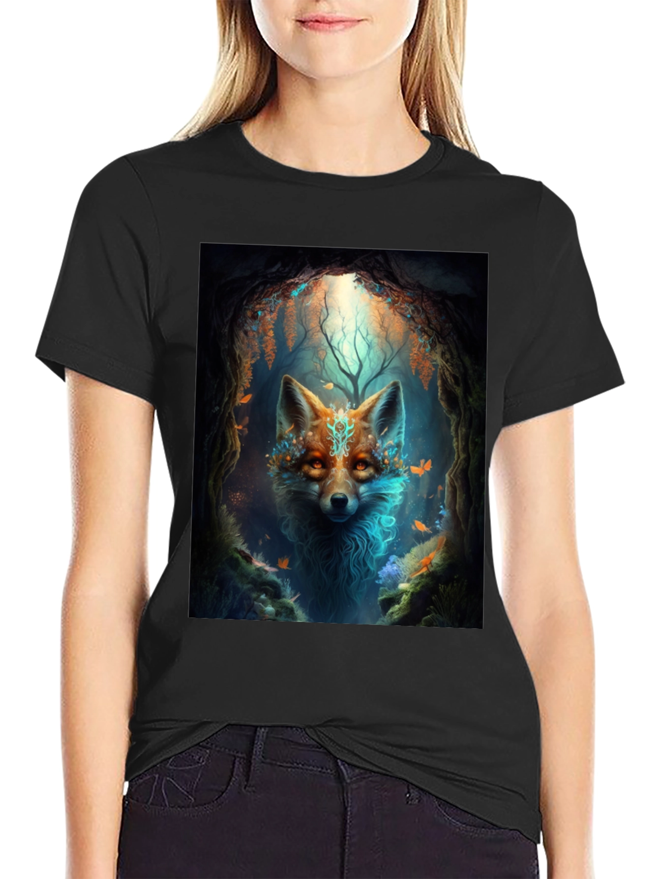 Unleash your wild side with this eye-catching graphic tee. Featuring a vibrant image of a mystical fox in a lush forest setting, this black t-shirt is sure to turn heads. The intricate artwork showcases a detailed fox with glowing eyes, surrounded by enchanting foliage and fluttering butterflies, creating a captivating and magical design. Made from a comfortable and durable fabric, this tee is perfect for everyday wear. Whether you're exploring the outdoors, hanging out with friends, or simply expressing your unique style, this mystic fox tee is a must-have addition to your wardrobe. Embrace the spirit of the forest and stand out from the crowd.
