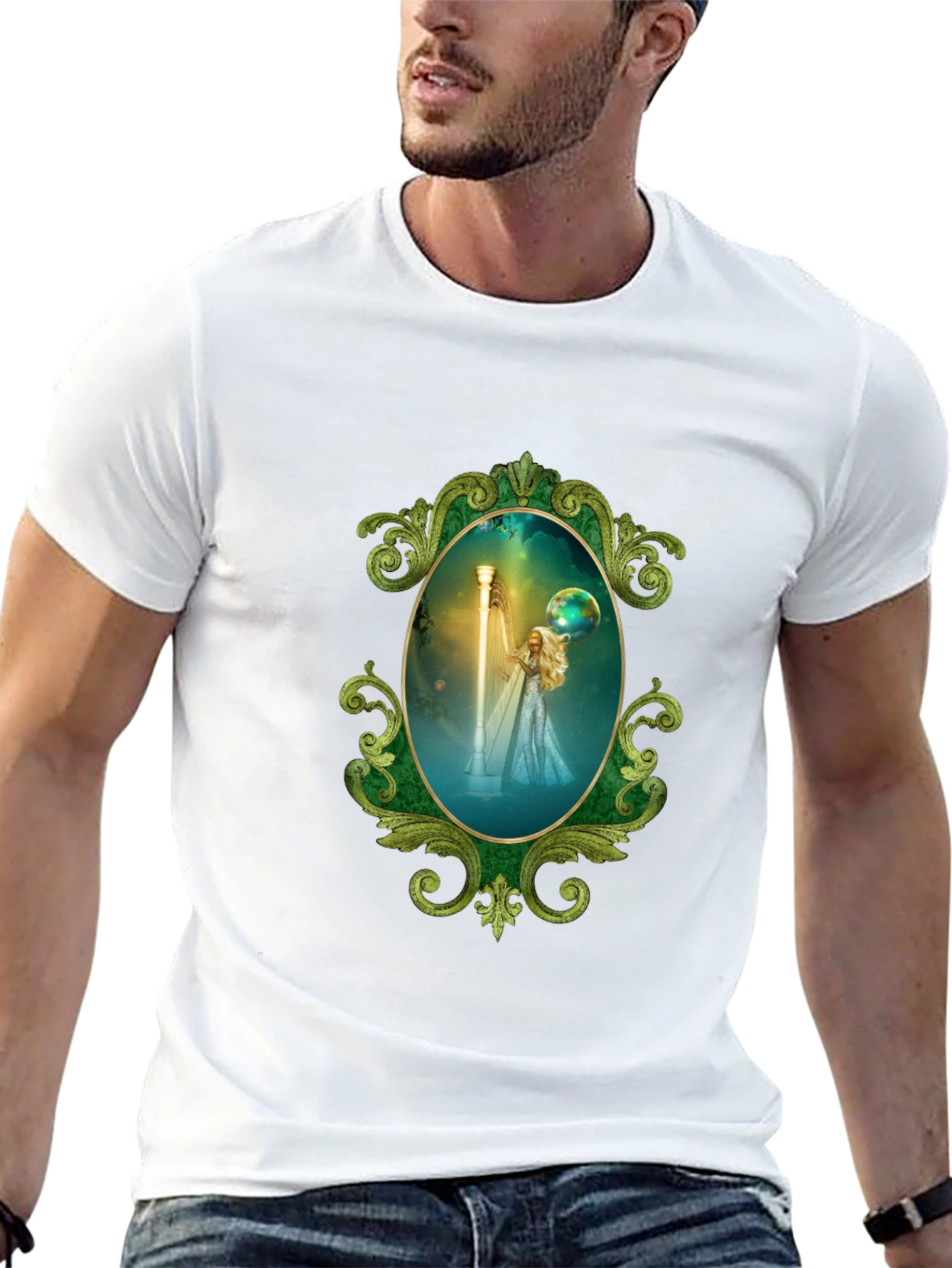 Embrace the mystical with this unique black graphic tee. The design features an ornate, green and gold frame showcasing a fantasy scene. Inside, a blonde woman in a flowing white dress holds a glowing staff and colorful orb, creating a captivating focal point. Made from a comfortable-looking dark fabric, this shirt is perfect for casual wear or adding an element of fantasy to your everyday style. Stand out from the crowd with this eye-catching and detailed design. Great for expressing your love of fantasy or unique art.