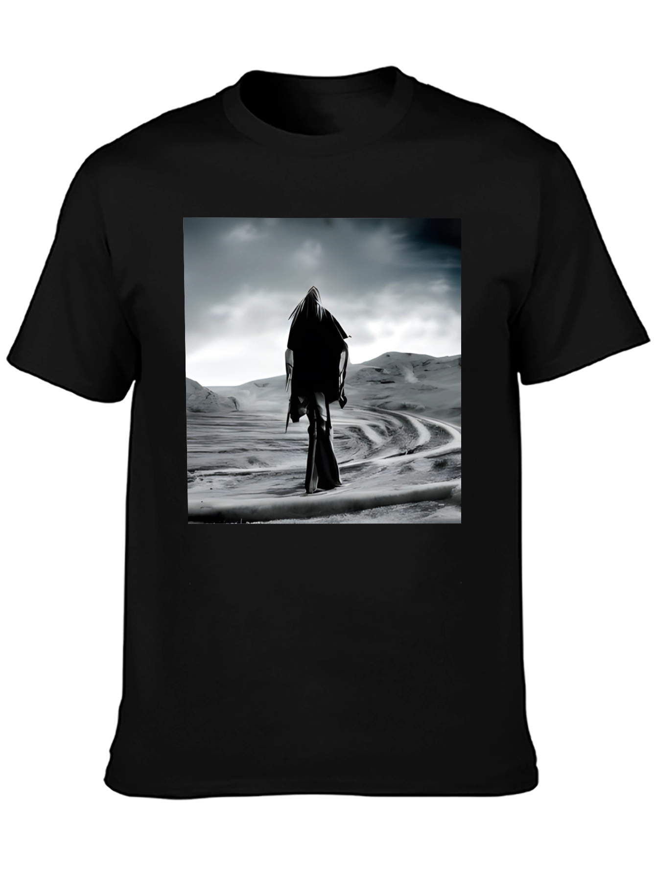 Embrace the enigmatic with this black, short-sleeved t-shirt featuring a captivating graphic print. The design showcases a solitary figure in a dark cloak traversing a desolate landscape, evoking a sense of mystery and adventure. Crafted from soft cotton, this tee offers exceptional comfort and breathability for all-day wear. The striking black and white graphic adds an element of intrigue to your everyday style. Perfect for casual outings, artistic expressions, or as a unique gift for the introspective soul. Express your individuality with this intriguing and stylish tee.