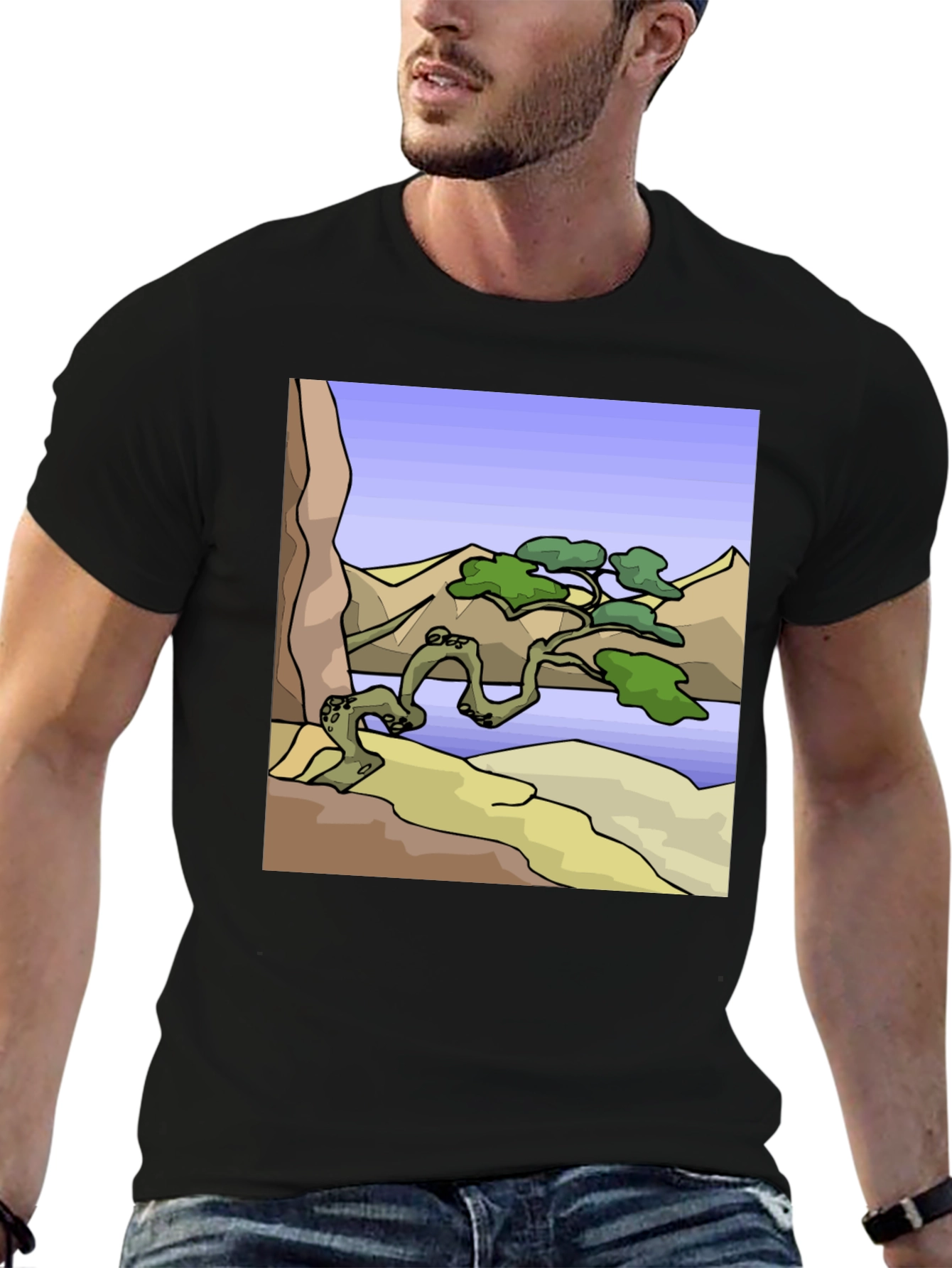 Show off your love for nature with this eye-catching graphic t-shirt. The shirt features a unique design of a stylized tree perched atop a rocky landscape against a serene mountain backdrop. Crafted from a comfortable, breathable fabric, this black t-shirt offers a relaxed fit, perfect for everyday wear. The high-quality print ensures the vibrant colors and intricate details of the design stand out. Ideal for casual outings, nature enthusiasts, or anyone looking to add a touch of artistic flair to their wardrobe. Make a statement with this wearable piece of art!