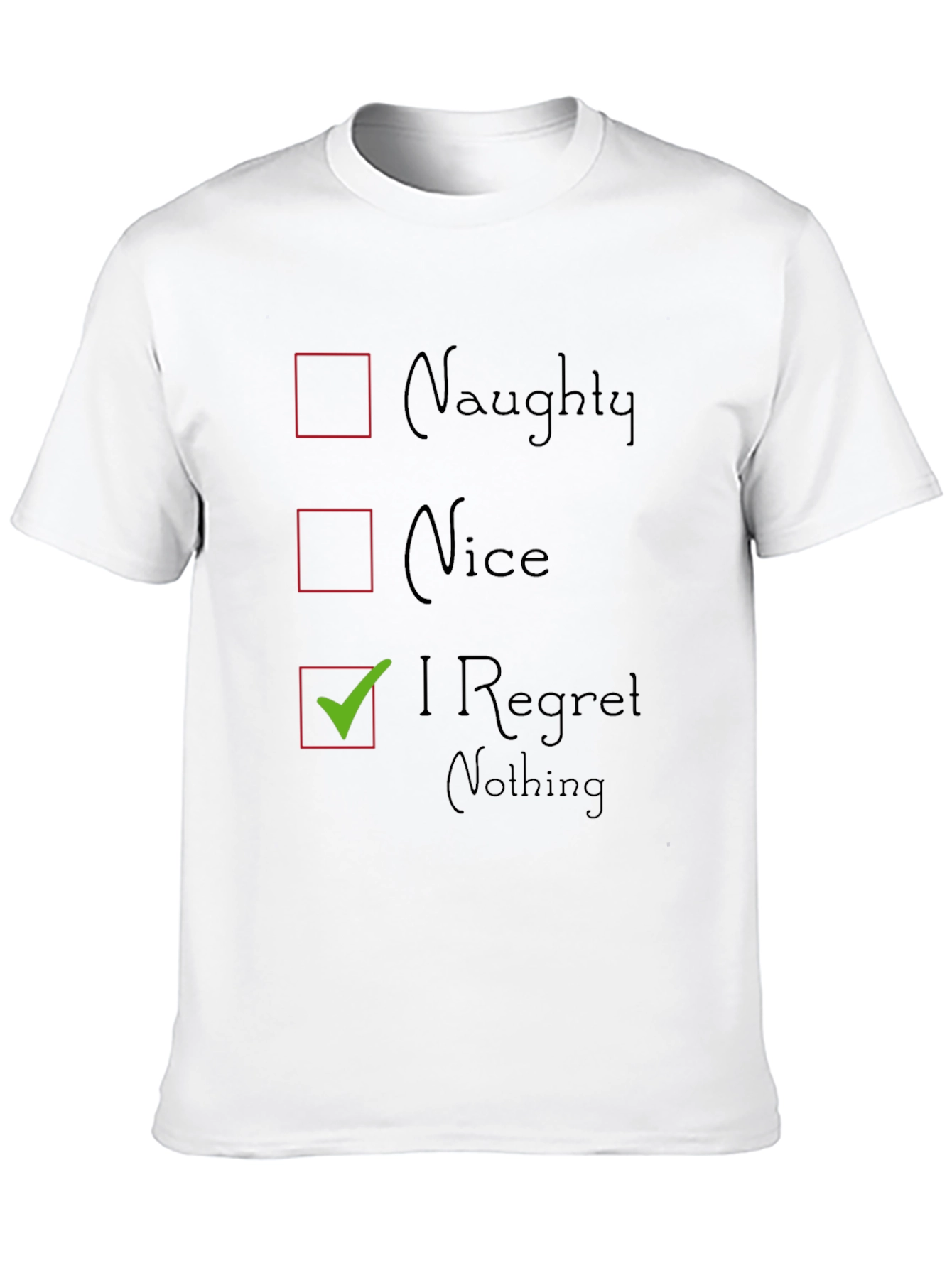 This black t-shirt features a humorous graphic perfect for those with a bold sense of humor. The design includes checkbox options for "Naughty," "Nice," and "I Regret Nothing," with the last option checked in green. Made from a soft, comfortable fabric, this tee is ideal for casual wear and is sure to get a laugh. Show off your rebellious side and make a statement with this unique and playful tee, ideal for parties, holidays, or everyday fun. A perfect conversation starter!