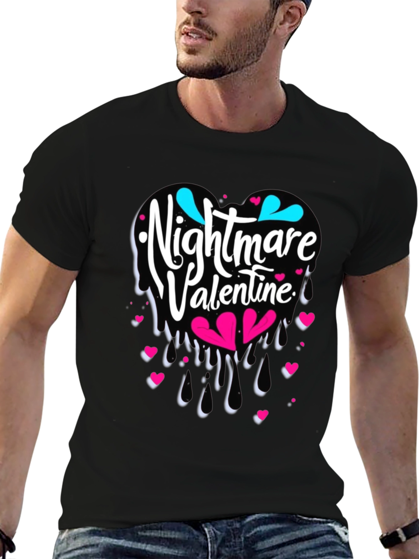 Embrace the spooky side of love with this black t-shirt. This striking tee features a unique heart graphic with the words "Nightmare Valentine" in dripping white lettering. Accented with vibrant blue and pink hearts, this tee adds a playfully macabre touch to any outfit. Made from a soft, breathable fabric, this shirt is as comfortable as it is eye-catching. Wear it for Valentine's Day with a twist, Halloween, or any day you want to make a statement. Perfect for those who love alternative fashion.