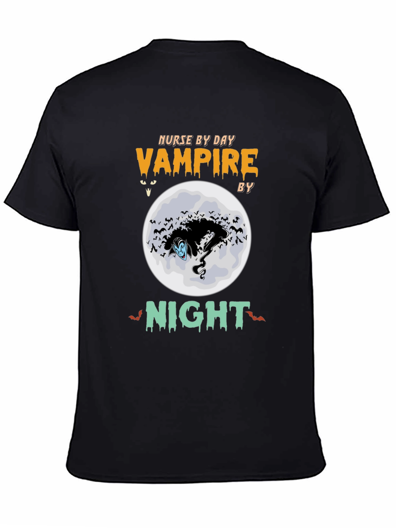 Embrace spooky season with this novelty tee! This black t-shirt features a fun design with the words "Nurse by Day Vampire by Night" above and below a spooky moon scene. The design incorporates bats, a stylized vampire face, and Halloween-themed text elements. Made from what appears to be a soft, breathable fabric, this shirt is perfect for casual wear during Halloween festivities, costume parties, or just showing off your unique sense of humor. It's a comfortable and eye-catching way to celebrate the season.