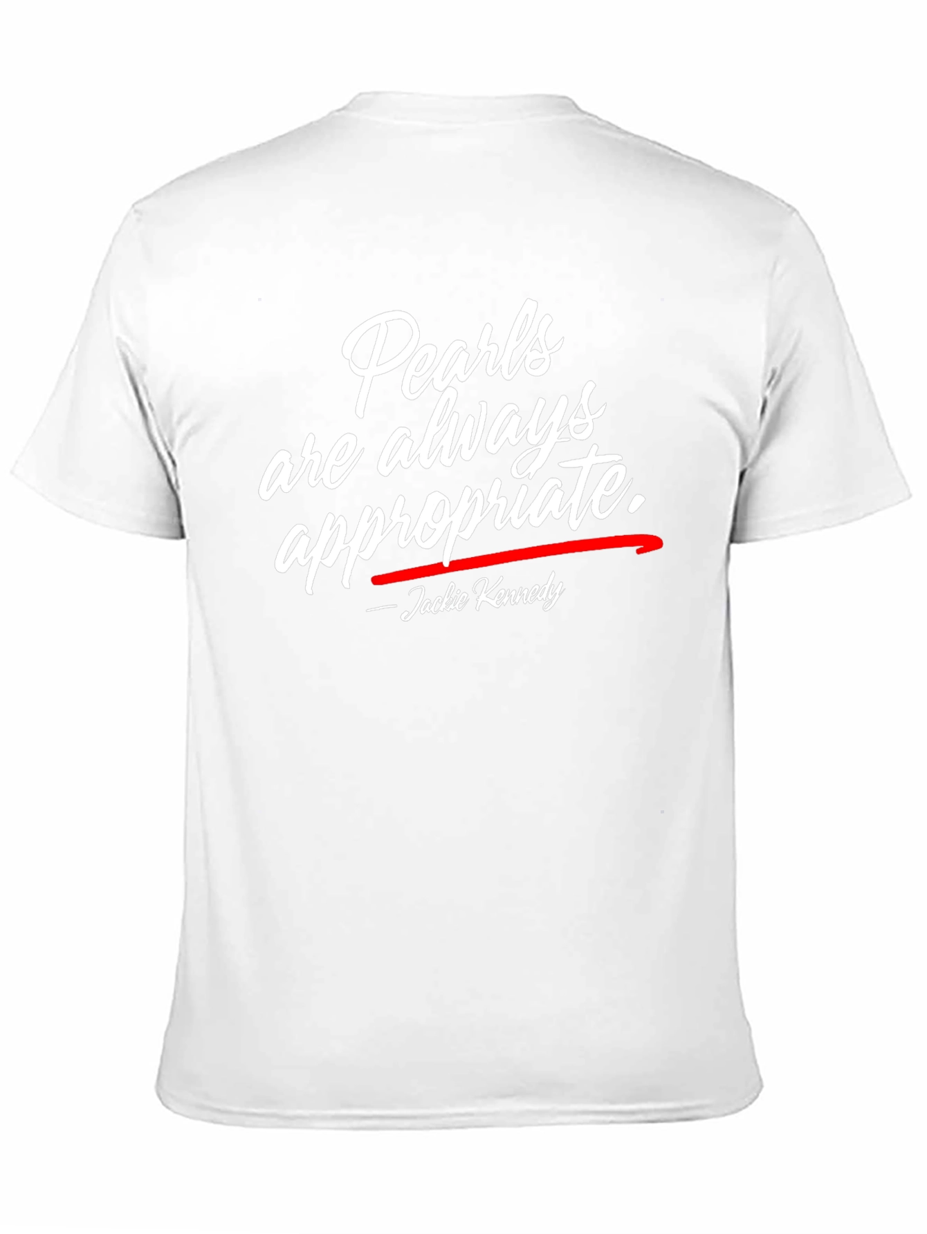 This classic black T-shirt features the timeless quote "Pearls are always appropriate" in elegant white script, underlined in red. Attributed to Jackie Kennedy, the quote adds a touch of sophistication and style. Made from a soft, comfortable fabric, this tee is perfect for everyday wear. Show off your love for iconic fashion statements with this stylish and empowering shirt. Ideal for casual outings, or as a conversation starter. Available in various sizes.