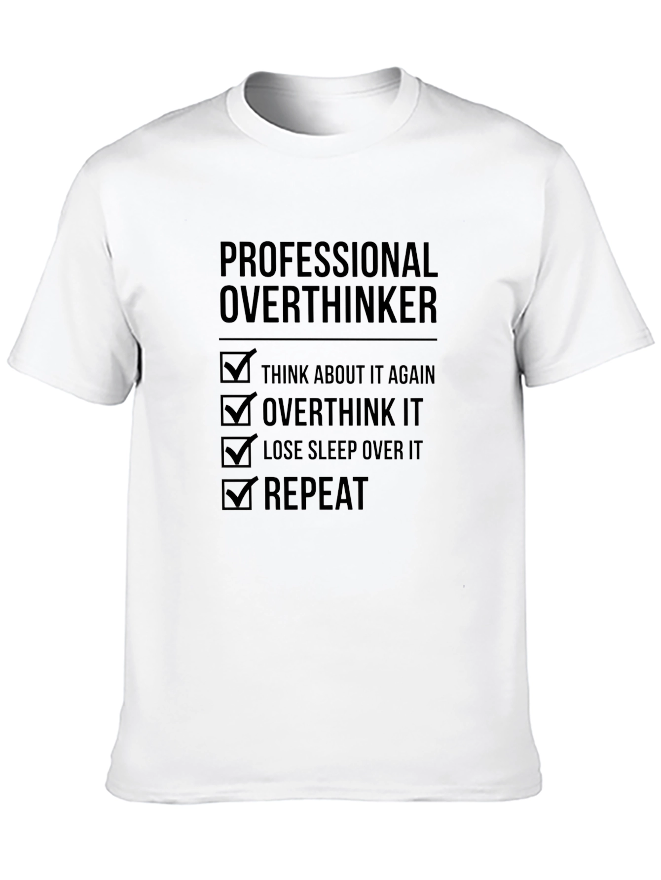 This black t-shirt features a humorous graphic design that speaks to the perpetually pensive individual. The text "PROFESSIONAL OVERTHINKER" sits boldly at the top, followed by a checklist of common overthinking habits: "THINK ABOUT IT AGAIN", "OVERTHINK IT", "LOSE SLEEP OVER IT", and finally, "REPEAT," each marked with a check. The design's witty statement will surely resonate with anyone who is prone to deep thought and reflection. Crafted from a comfortable fabric, this short-sleeved tee is suitable for everyday wear. Wear it casually or at home. It's a great conversation starter and a fun way to express your personality. It is the perfect gift for friends or family who are known for their thoughtful nature and enjoy a touch of humor in their wardrobe.