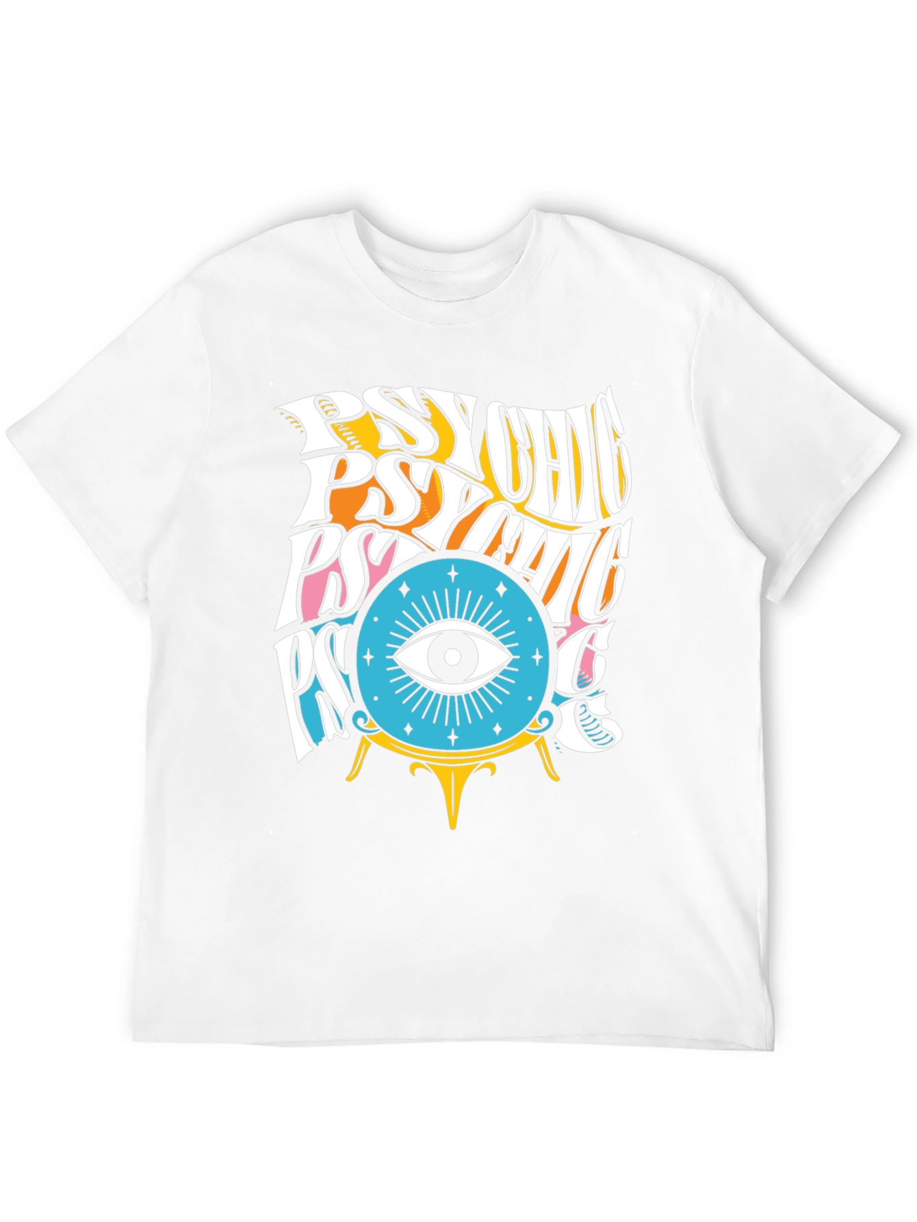 Embrace your inner mystic with this unique tee! This black t-shirt features a striking graphic design with the word "Psychic" repeated in a wavy retro font in orange, pink and white. Below it sits a central teal eye symbol with rays emitting outwards, placed upon a gold pedestal. Made from a soft and comfortable fabric, this stylish shirt is perfect for everyday wear or for making a statement at your next gathering. Show off your quirky style and intrigue those around you!