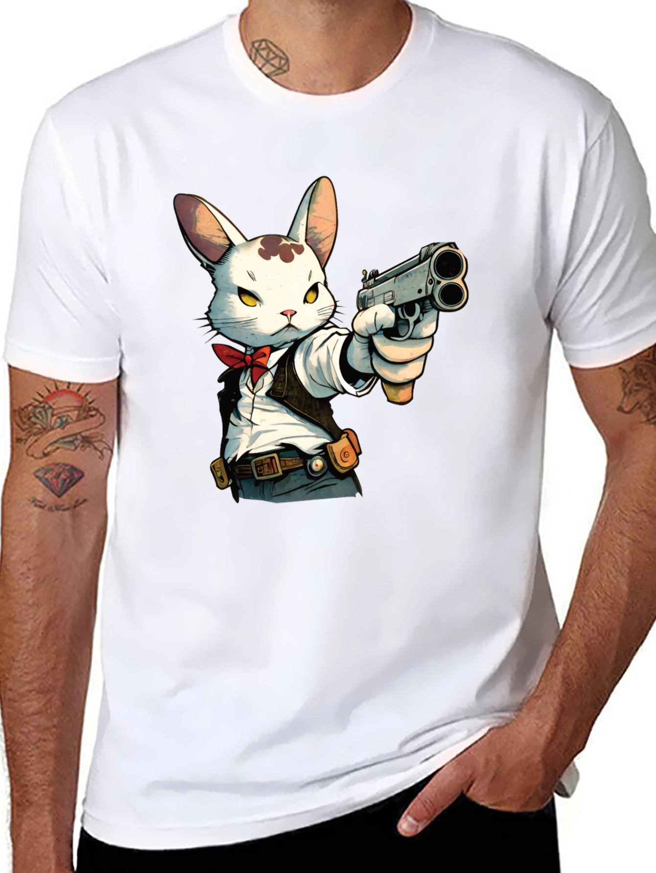 Make a statement with this unique graphic t-shirt. Featuring a bold design of a rabbit dressed as a gangster, complete with a bow tie and gun, this shirt is sure to turn heads. The design is printed on a black, soft, comfortable fabric. The details, like the rabbit's piercing yellow eyes, add character and uniqueness to this eye-catching design. This t-shirt is perfect for casual wear, parties, or as a gift for someone with a quirky sense of style. Show off your edgy side and start conversation wherever you go with this Rabbit Gangster Graphic T-Shirt.