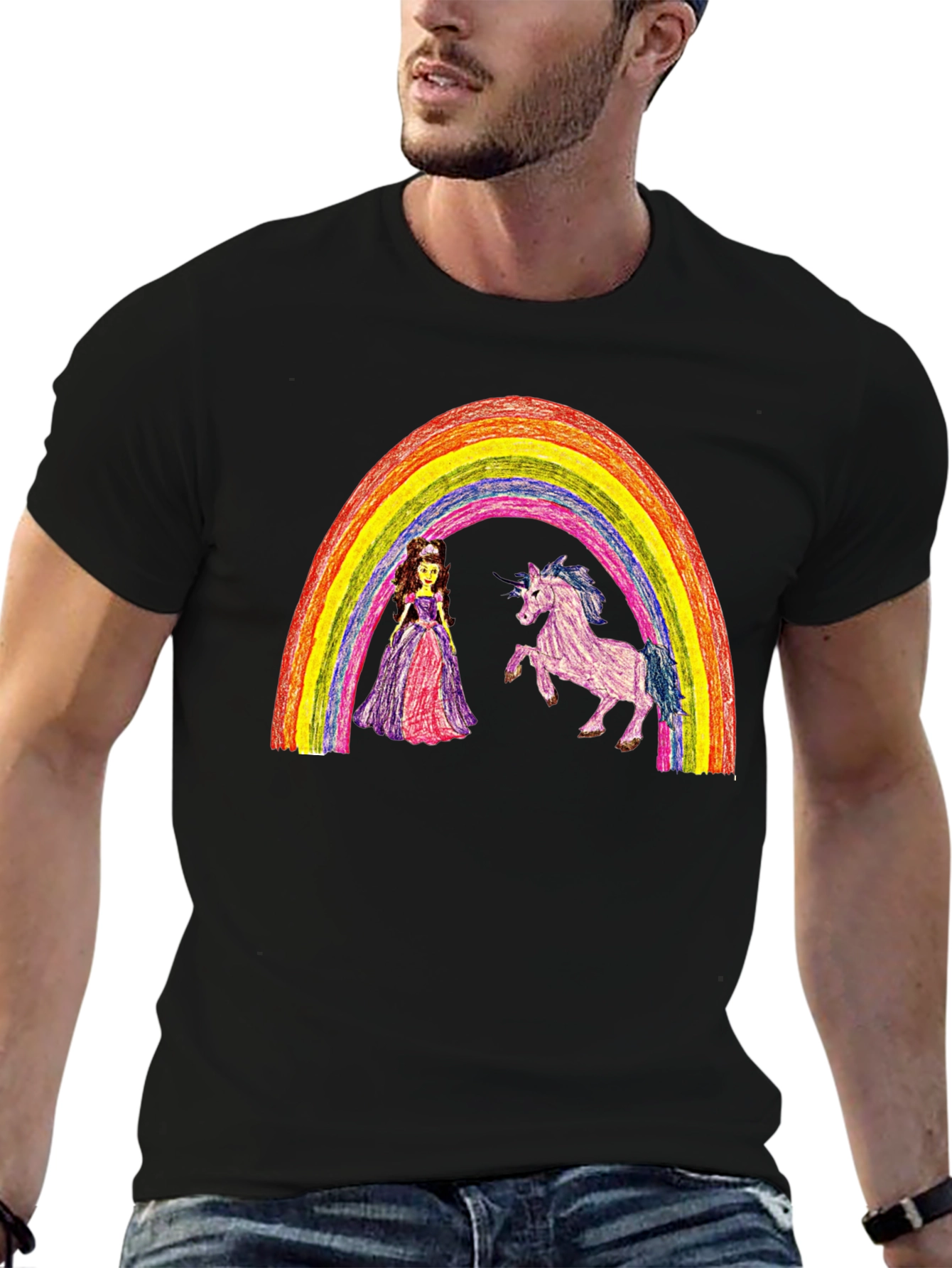Show off your whimsical side with this eye-catching t-shirt! The design features a vibrant rainbow arching over a cute princess and a magical unicorn, all rendered in a charming, childlike style. Made from a comfortable black fabric, this tee is perfect for casual wear, expressing your unique personality, or as a fun gift for anyone who loves fantasy and imagination. Stand out from the crowd with this playful and distinctive piece that is sure to spark conversation and smiles wherever you go. Let your inner child shine with this fun and imaginative t-shirt!