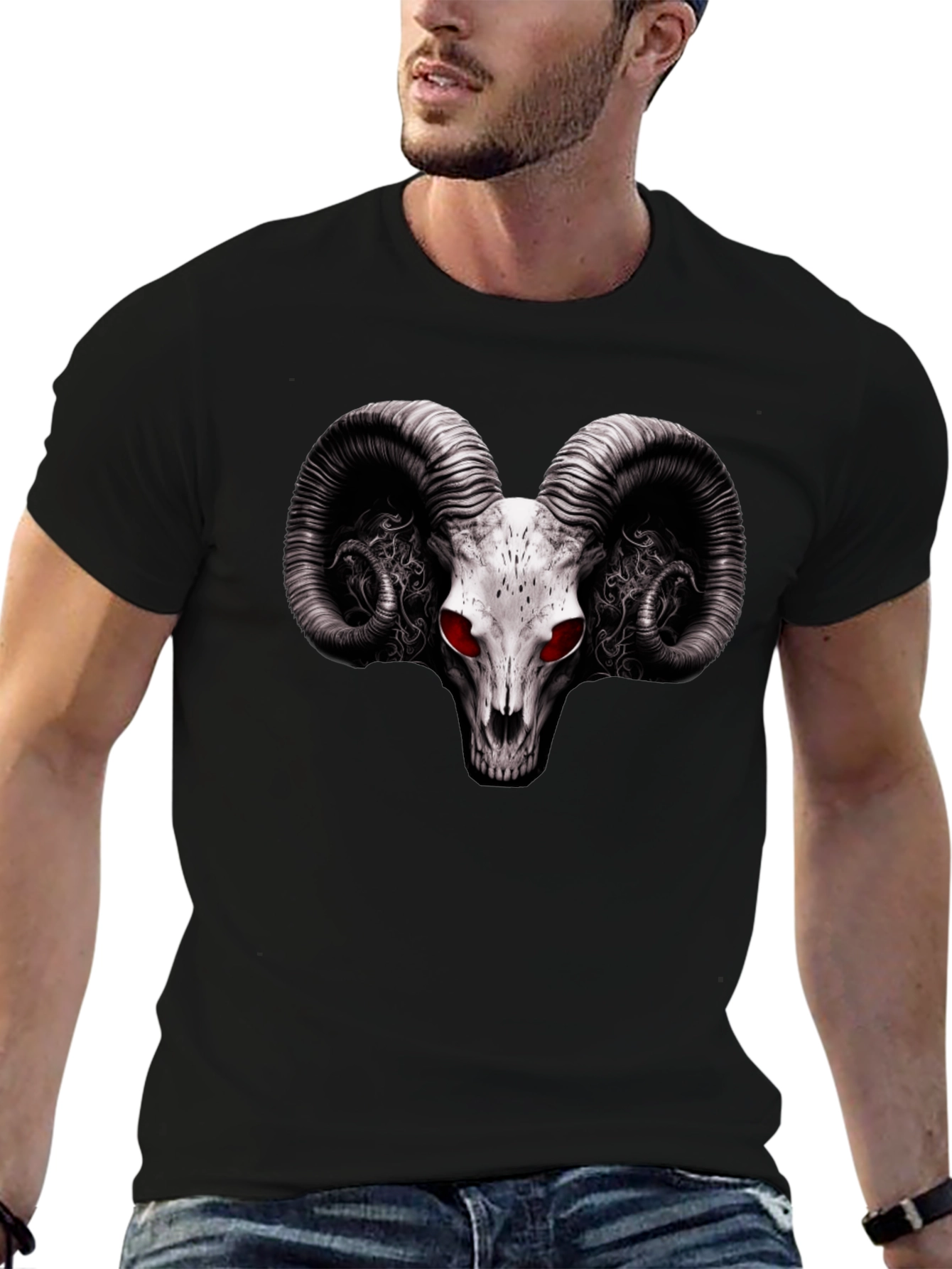 Make a statement with this striking black graphic t-shirt. The shirt features a detailed white ram skull design with piercing red eyes, creating a bold and edgy aesthetic. The intricate detailing on the horns and skull adds a unique touch. Made from comfortable, breathable fabric, this t-shirt is perfect for casual wear, concerts, or making a statement. Pair it with jeans or shorts for a standout look. This tee is sure to turn heads and is ideal for anyone who loves unique and alternative fashion.