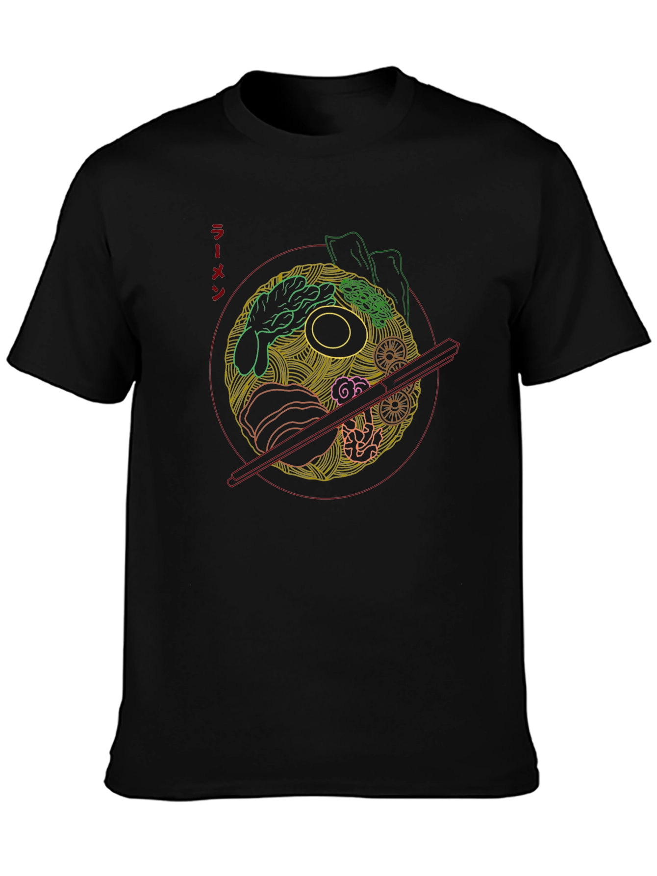 Elevate your wardrobe with this eye-catching black t-shirt featuring a vibrant ramen bowl graphic. The design showcases a detailed illustration of a ramen bowl with noodles, egg, vegetables, and other toppings in neon-like colors. This unique tee combines comfort and style, making it perfect for everyday wear. The eye-catching design adds a playful and trendy touch to any outfit. Show off your love for Japanese cuisine and stand out from the crowd with this conversation-starting piece. It's ideal for casual outings, foodie events, or simply expressing your unique style.