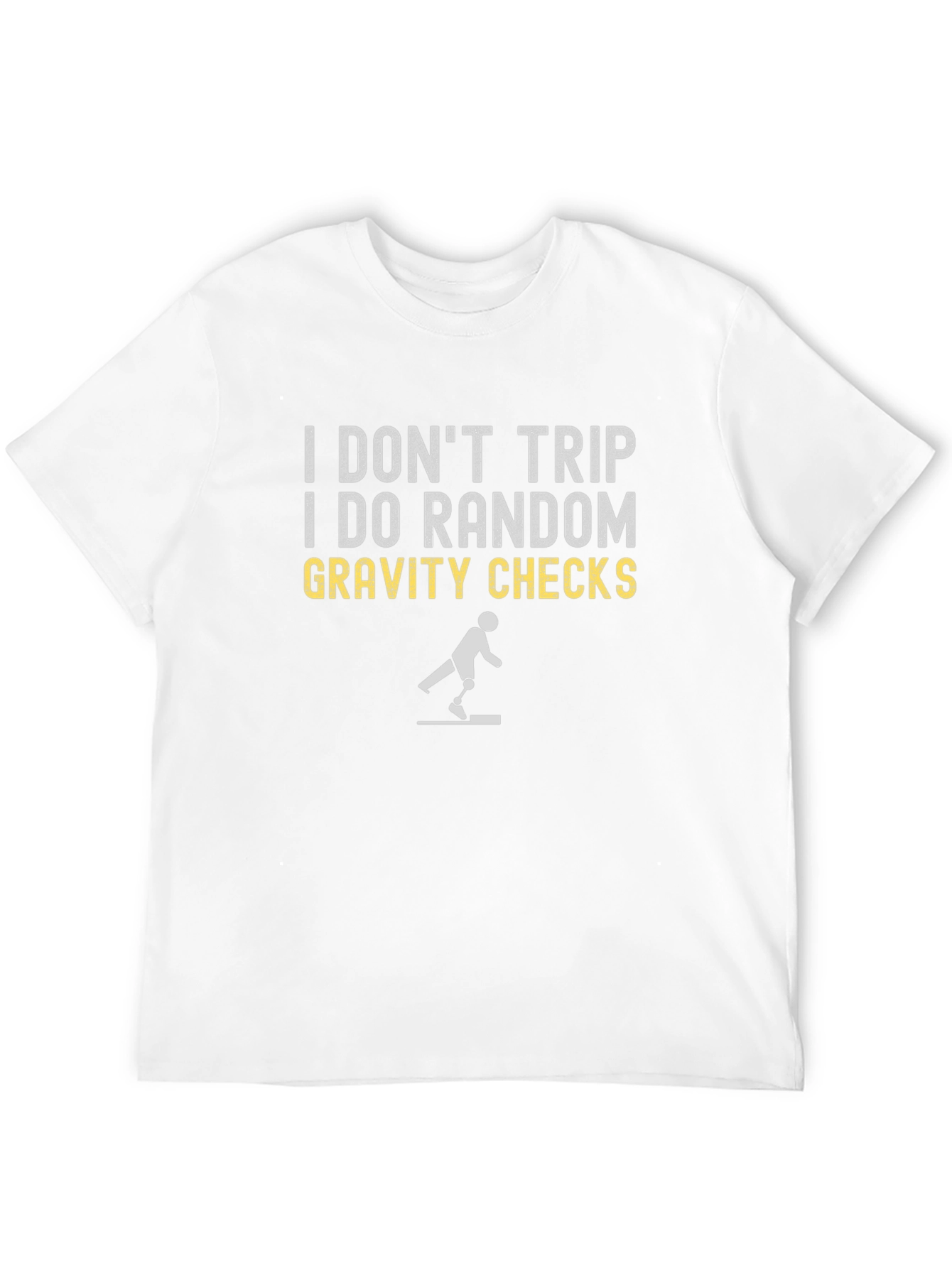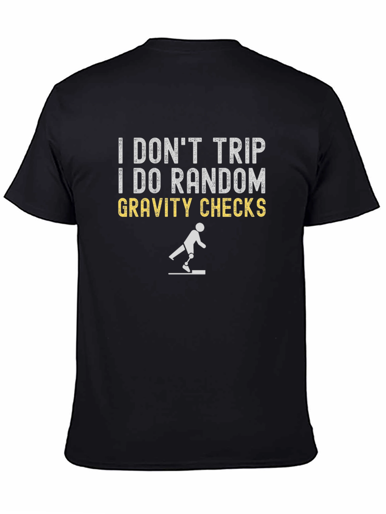 This black t-shirt features a humorous design that's sure to get a laugh. The witty phrase "I DON'T TRIP I DO RANDOM GRAVITY CHECKS" is printed across the chest in a bold font, with 'GRAVITY CHECKS' highlighted in yellow. Below the text is a graphic depicting a person appearing to stumble off a ledge, adding to the lighthearted theme. This shirt is made from a comfortable-looking fabric. Ideal for casual wear, this tee is perfect for anyone with a fun sense of humor. A great conversation starter and a unique addition to any wardrobe.