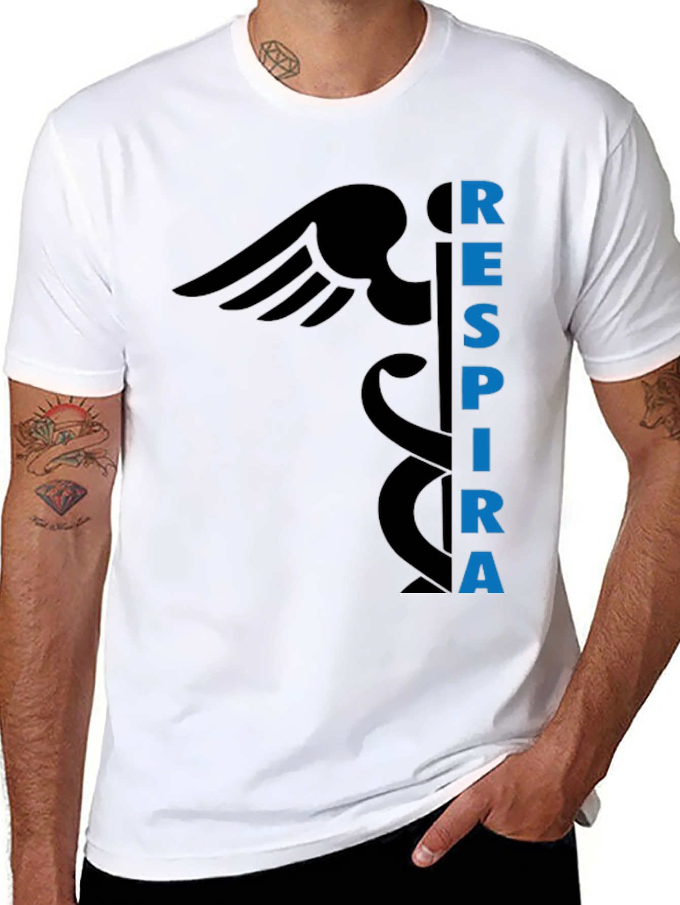 This stylish black t-shirt features a prominent medical symbol design alongside the word "RESPIRA" in a striking blue font. The design is vertically oriented, creating a modern and eye-catching look. Made from what appears to be a soft, comfortable fabric, this shirt is perfect for everyday wear. Its bold design makes it a great choice for medical professionals, students, or anyone who appreciates unique and expressive apparel. Wear it casually with jeans or dress it up with a blazer for a smart-casual look. A conversation starter and a comfortable wardrobe staple all in one.