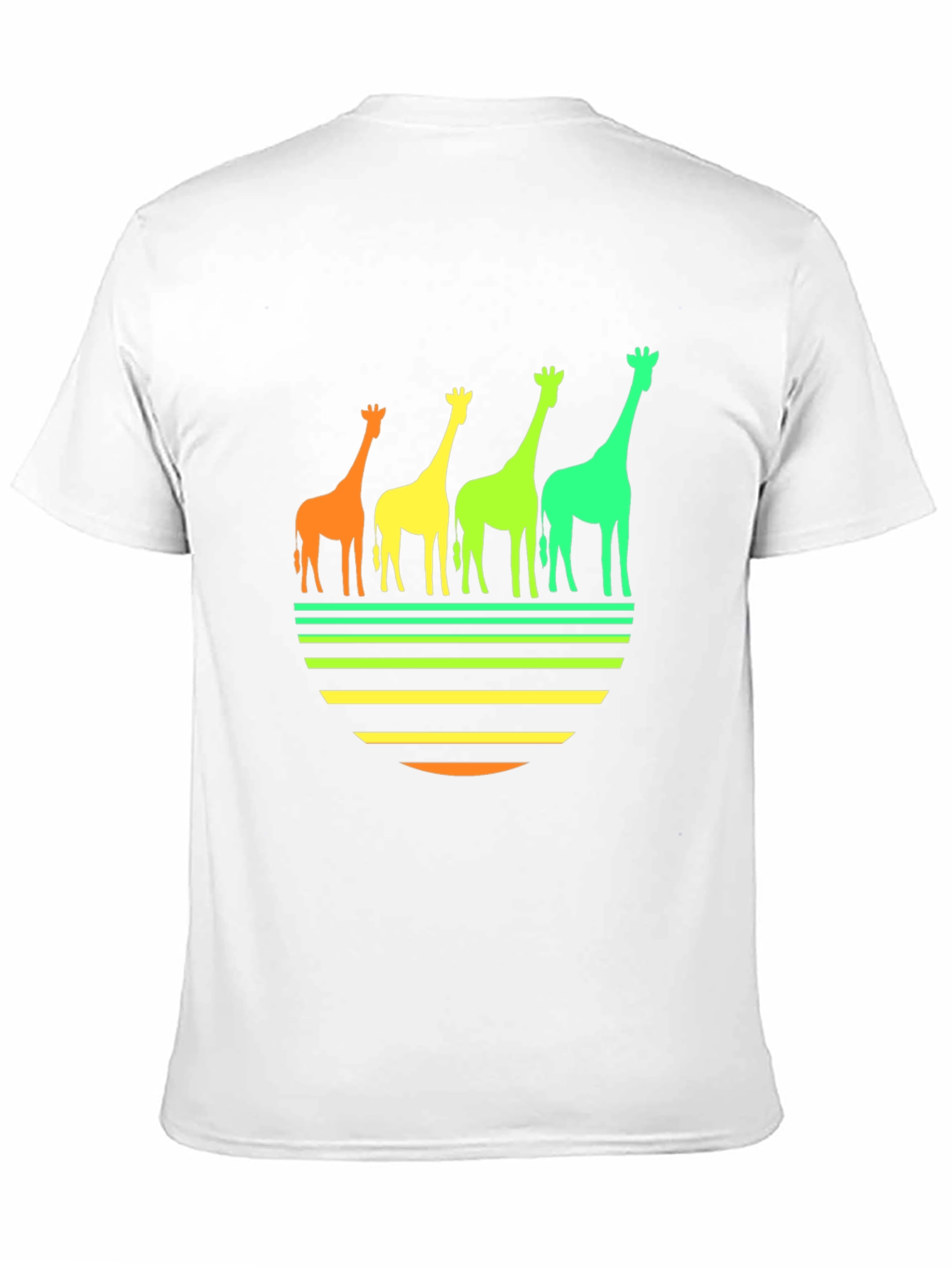Stand out with this eye-catching black t-shirt featuring a vibrant, retro-style giraffe design. The graphic showcases four giraffes in a gradient of colors (orange, yellow, green, and lime) standing above a striped sunset. Made from a comfortable, breathable fabric, this tee offers a relaxed fit perfect for everyday wear. Ideal for casual outings, weekend adventures, or as a unique gift for animal lovers. Add a touch of retro charm to your wardrobe with this stylish and comfortable giraffe sunset tee.