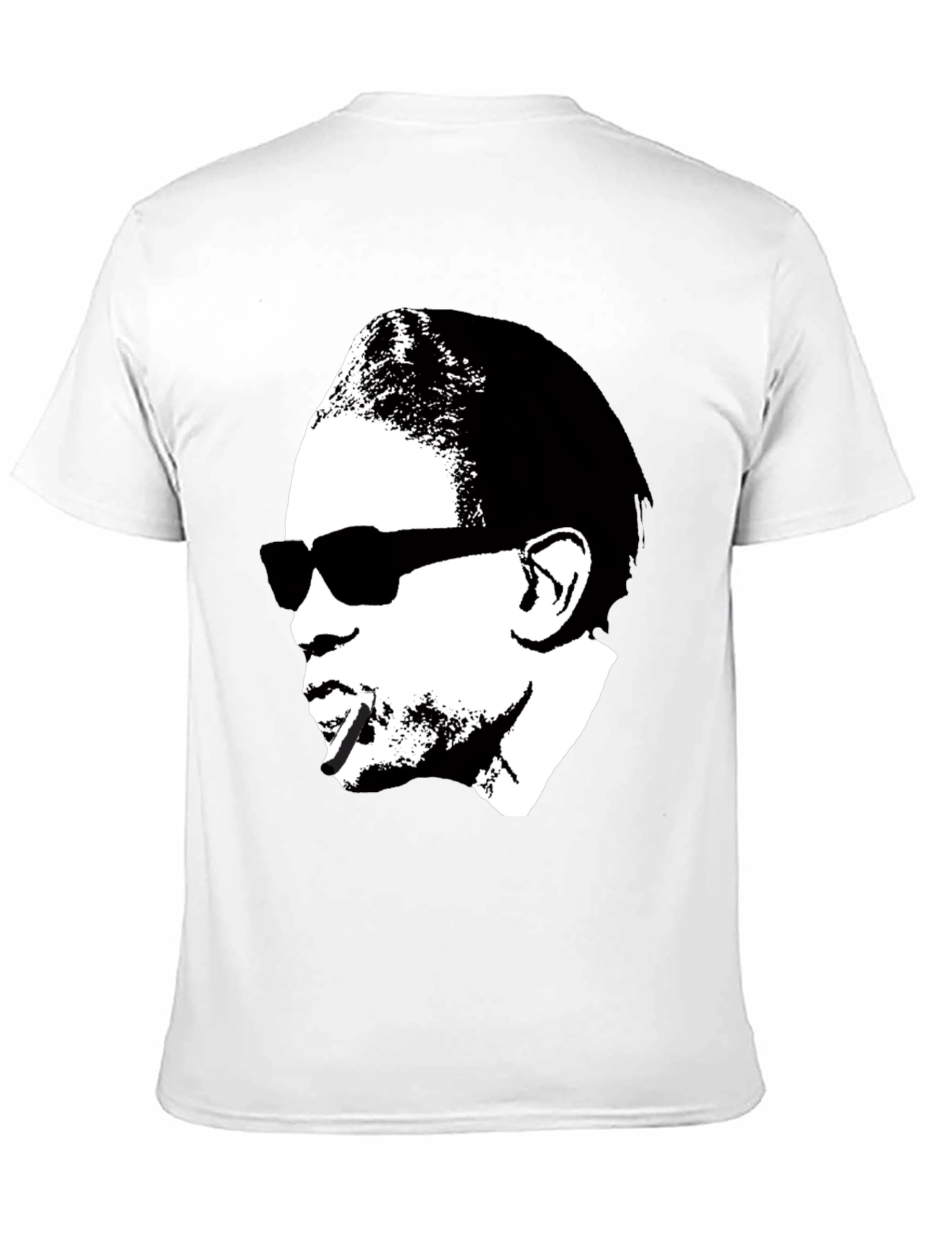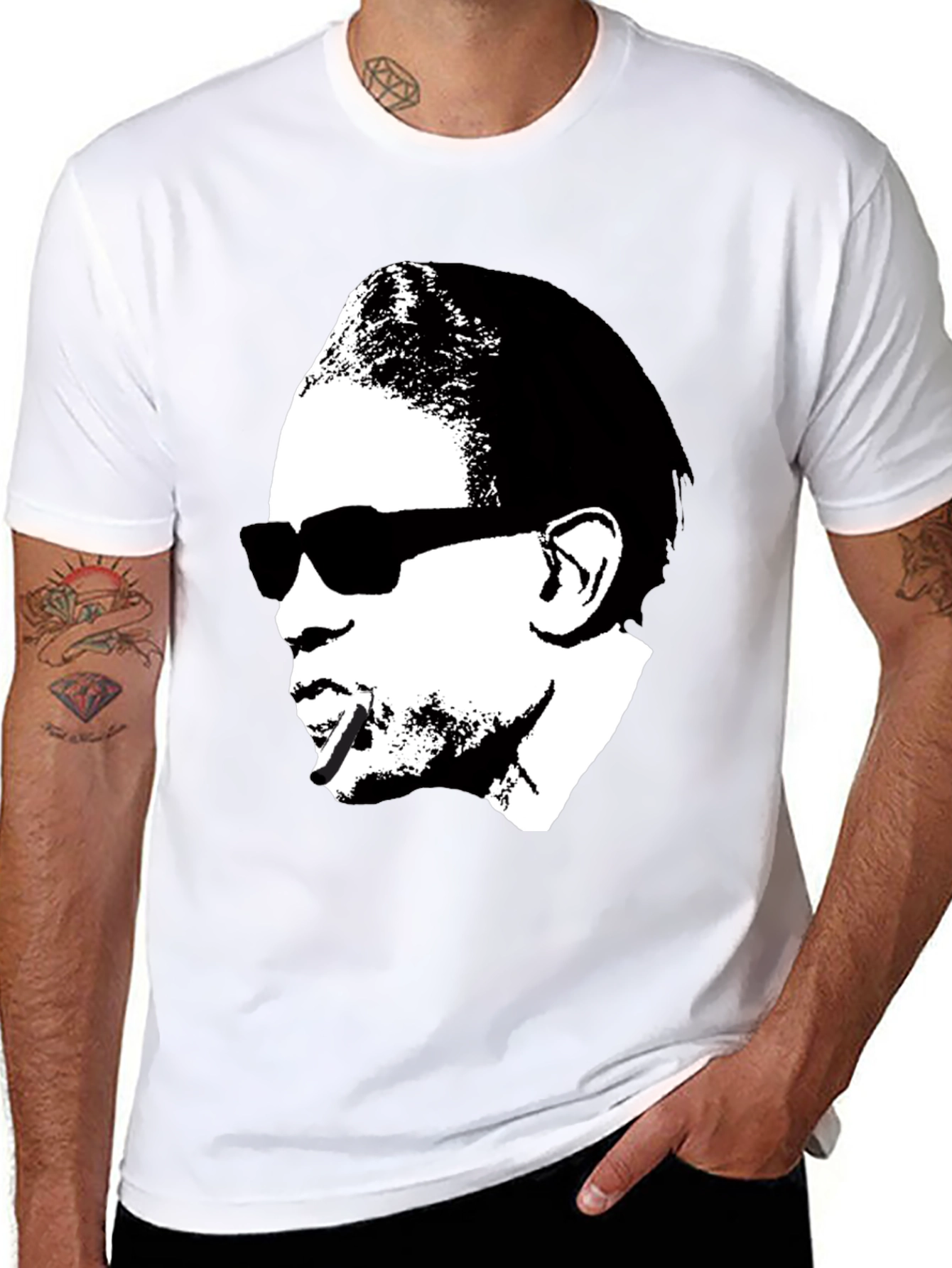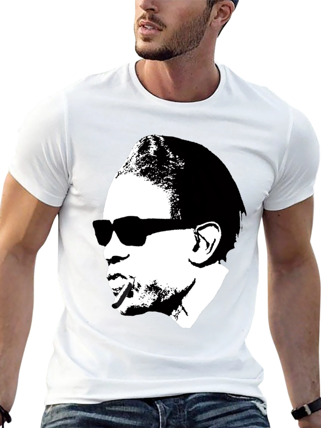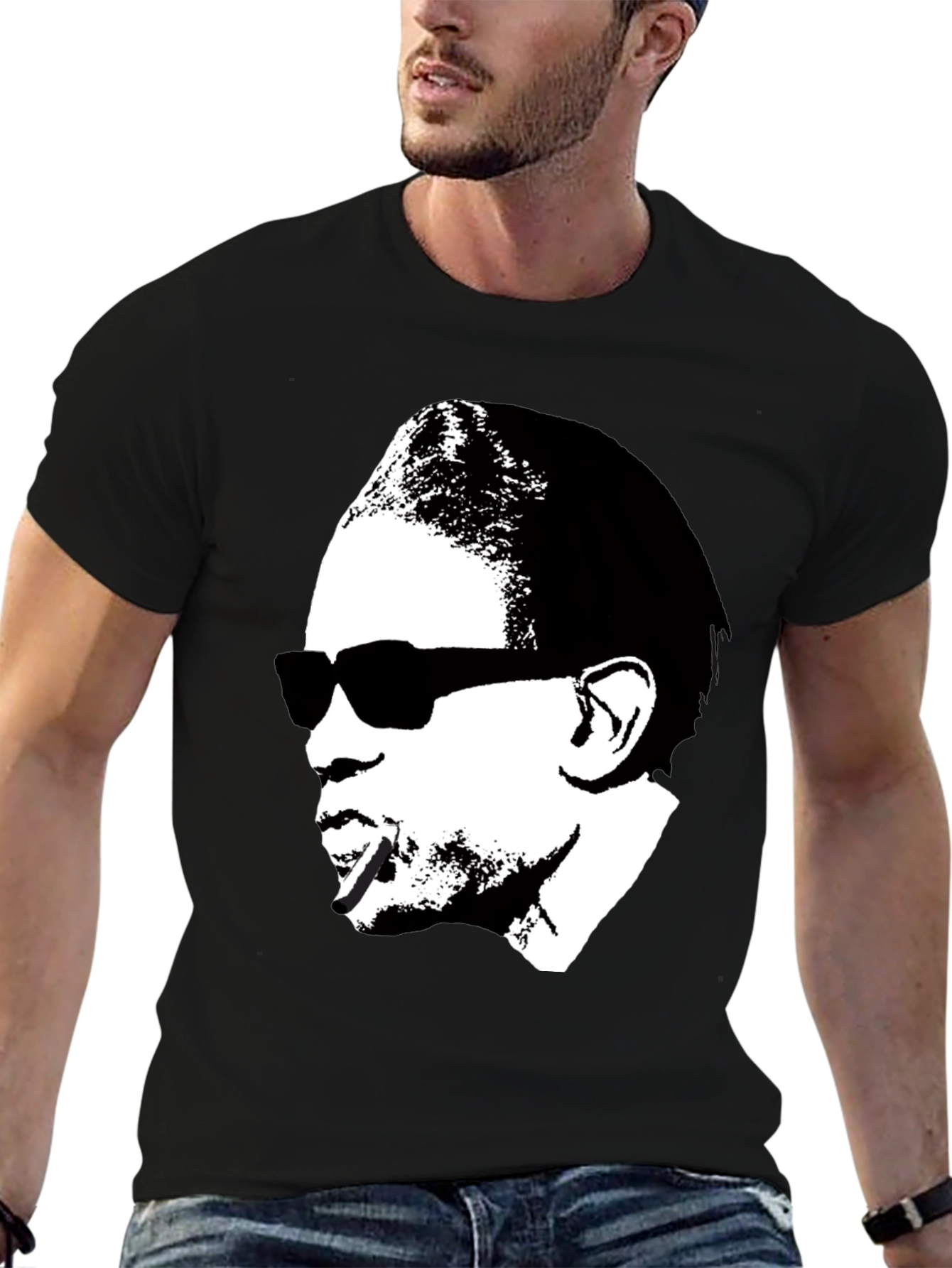 Show off your cool, confident style with this black t-shirt featuring a striking silhouette graphic. The design is a monochrome portrait of a man with sunglasses, lending a vintage, musical vibe to your wardrobe. Made from a soft, comfortable fabric, this tee is perfect for casual wear. Pair it with jeans or shorts for a relaxed weekend look, or dress it up with a jacket for a night out. Make a statement without saying a word! This tee is bound to become a favorite in your collection.