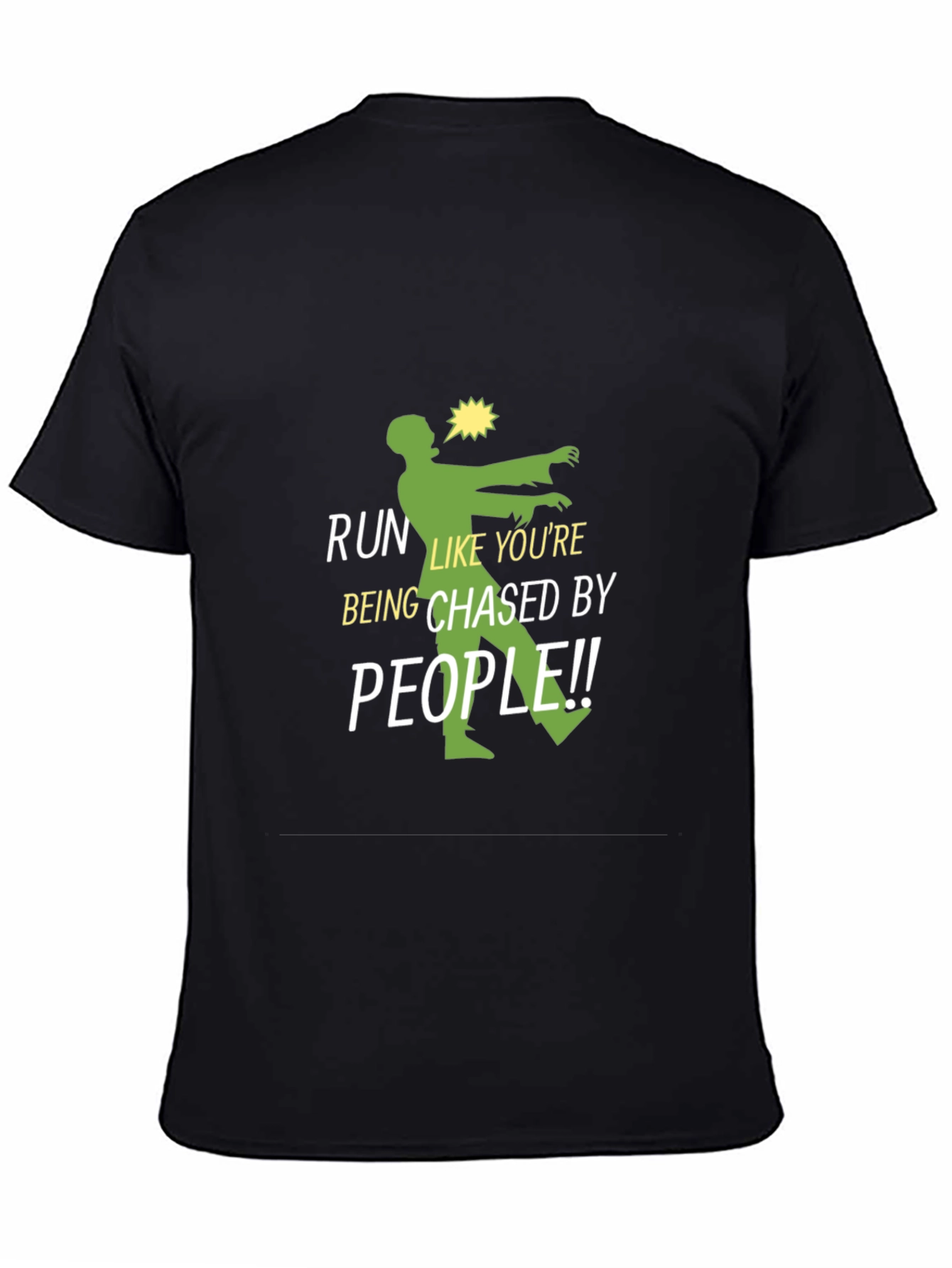 This black t-shirt features a humorous and eye-catching design. A green zombie graphic is accompanied by the text "RUN LIKE YOU'RE BEING CHASED BY PEOPLE!!" in white lettering. The design is playful and attention-grabbing, ideal for those with a fun sense of humor. Made from a comfortable material, this tee is perfect for casual wear, zombie walks, or making a statement. The shirt is well-suited for everyday wear and is bound to spark conversations. Its soft fabric ensures comfort while showcasing a unique and quirky style. Wear it to the gym, out with friends, or simply lounging at home.