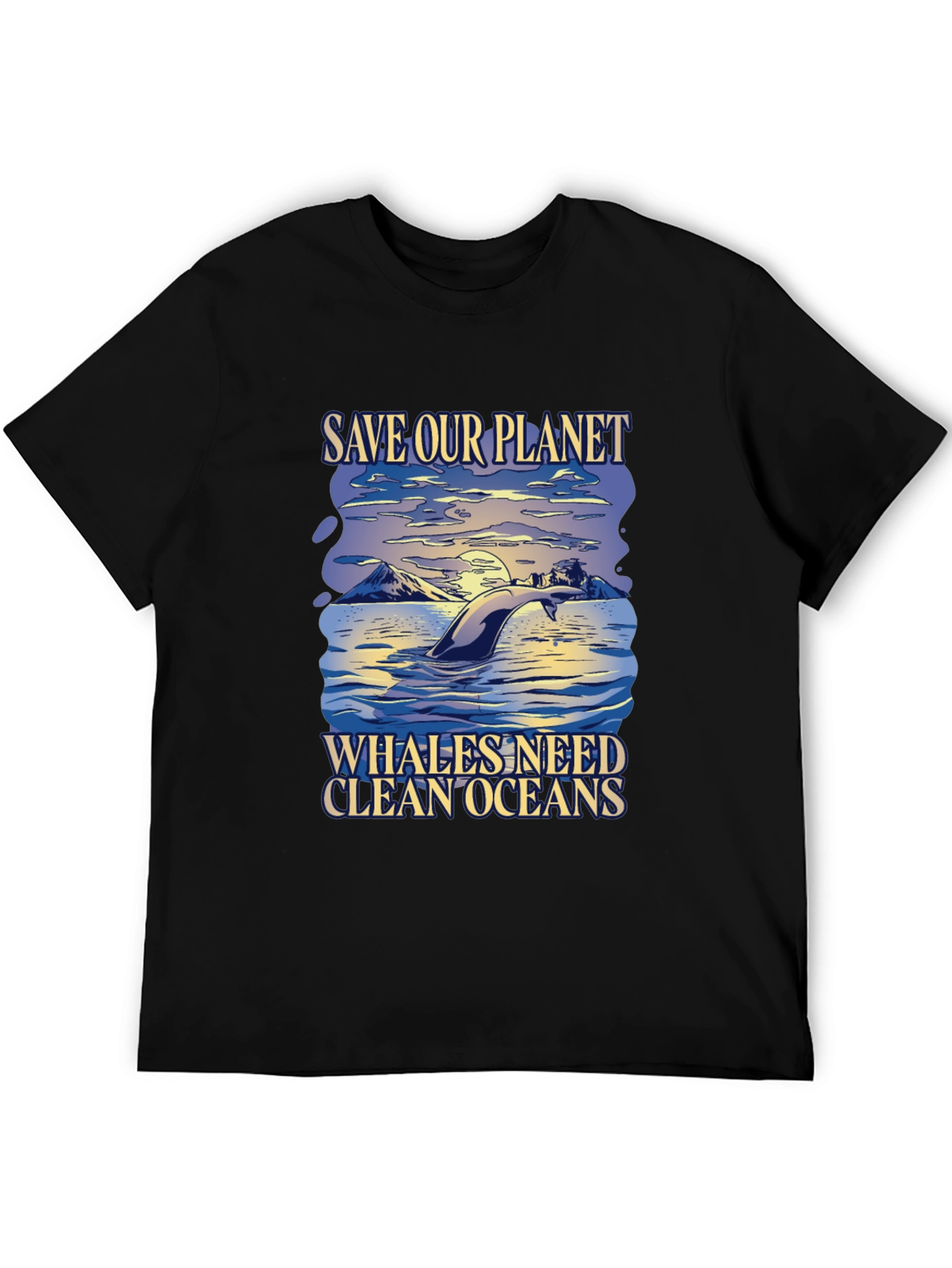 Show your love for the ocean with this stylish black t-shirt. Featuring a vibrant graphic of a whale tail rising from the ocean against a scenic mountain backdrop, the design incorporates the powerful message "Save Our Planet" and "Whales Need Clean Oceans". Made from a soft, comfortable fabric, this tee is perfect for everyday wear. Wear it proudly to raise awareness about ocean conservation or gift it to an eco-conscious friend. This unique t-shirt is a must-have for any nature lover's wardrobe!