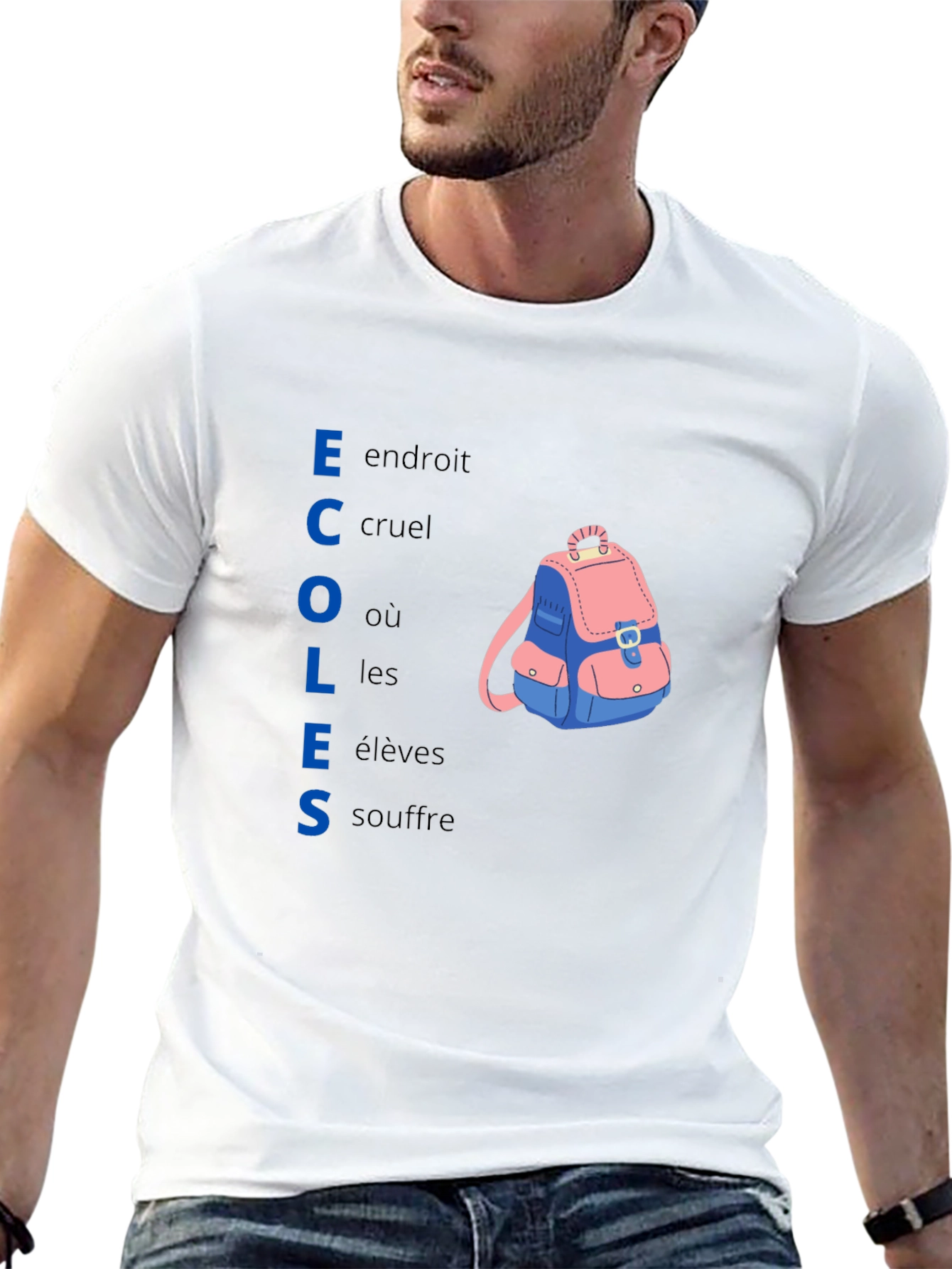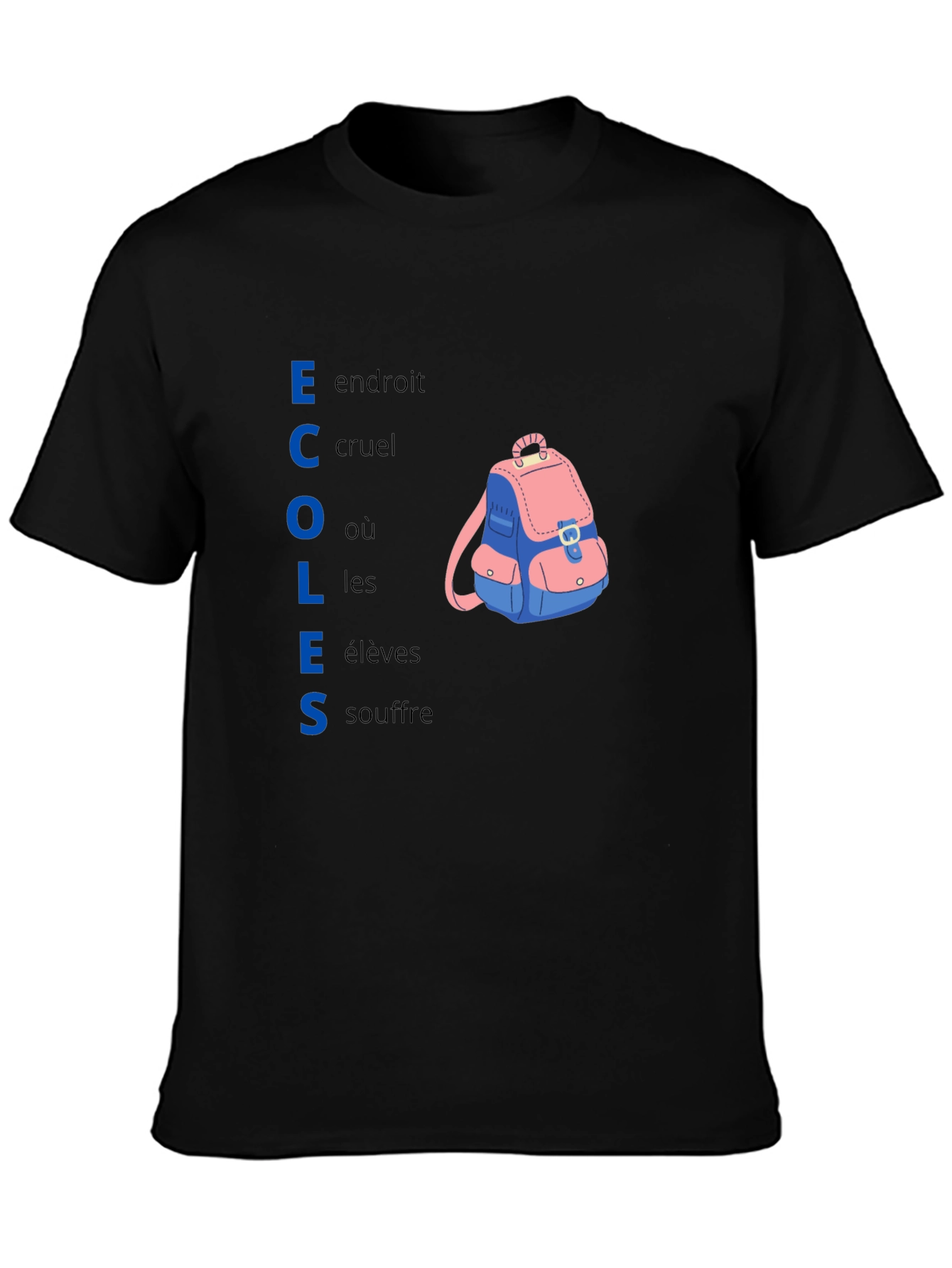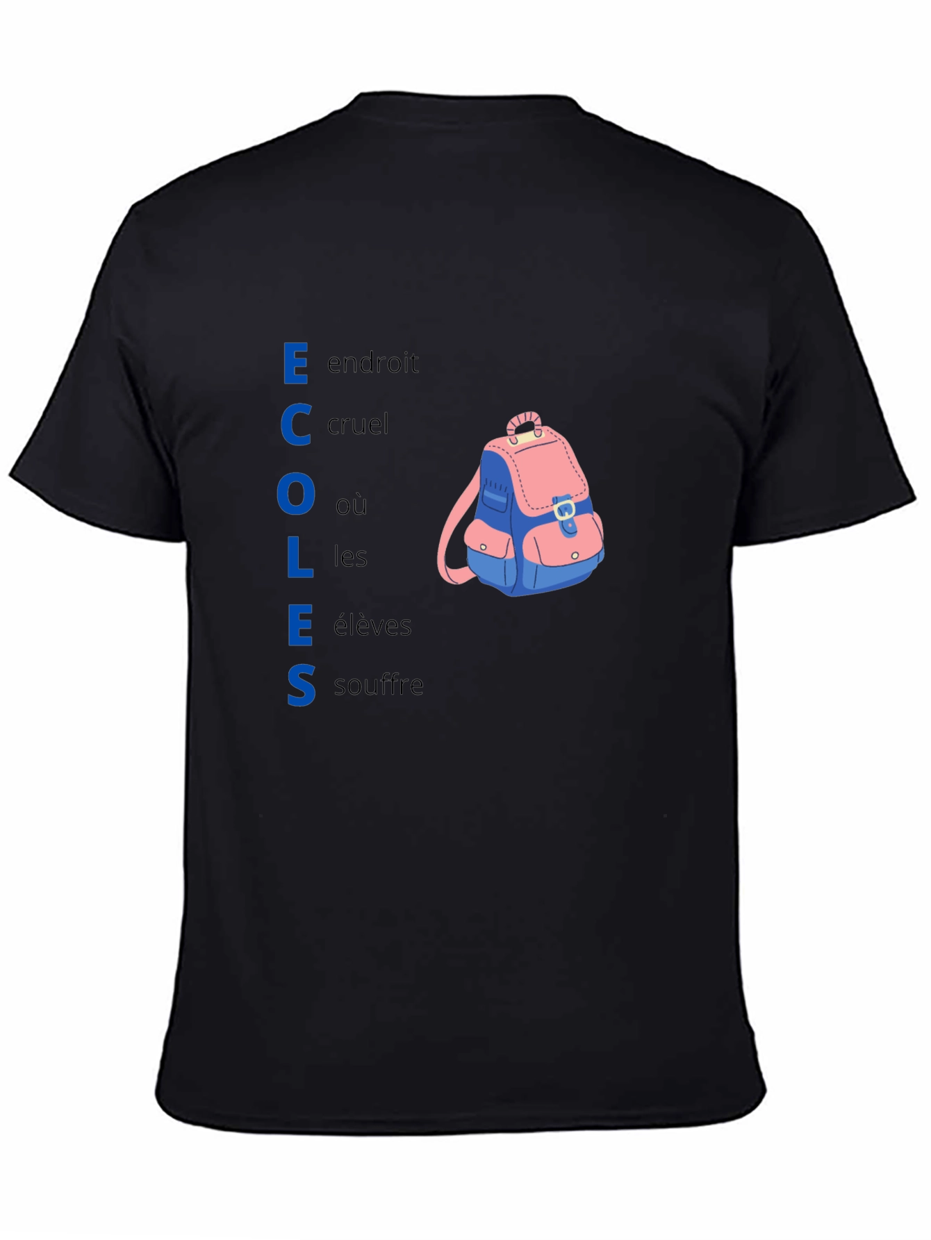 This black t-shirt features the word 'ECOLES' vertically stacked, with each letter also acting as the initial letter for the phrases 'endroit,' 'cruel,' 'où,' 'les,' and 'souffre.' These phrases, paired with the word "ECOLES", create a powerful statement about the hardships of school. It also features a cartoon-style backpack graphic, adding a touch of whimsy to the thought-provoking design. Made from a comfortable-looking fabric, this tee is perfect for those who want to express their feelings about the education system in a stylish and unique way. Wear it to school, protests, or anywhere you want to spark conversation and raise awareness.