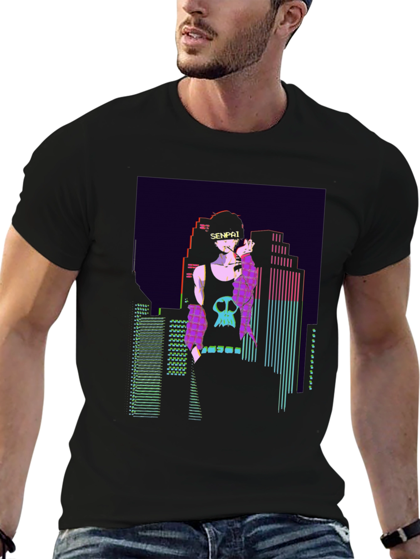 Show off your love for anime and urban style with this striking black T-shirt. Featuring a bold graphic print with vaporwave elements, it showcases a sleek anime figure with the word "Senpai" above, set against a backdrop of retro cityscapes in neon colors. The design includes cool skull and graffiti details, blending edgy and fashionable aesthetics. Made from comfortable, breathable material, this tee is perfect for casual wear, conventions, or expressing your unique personality. Pair it with jeans or shorts for an effortlessly cool look.