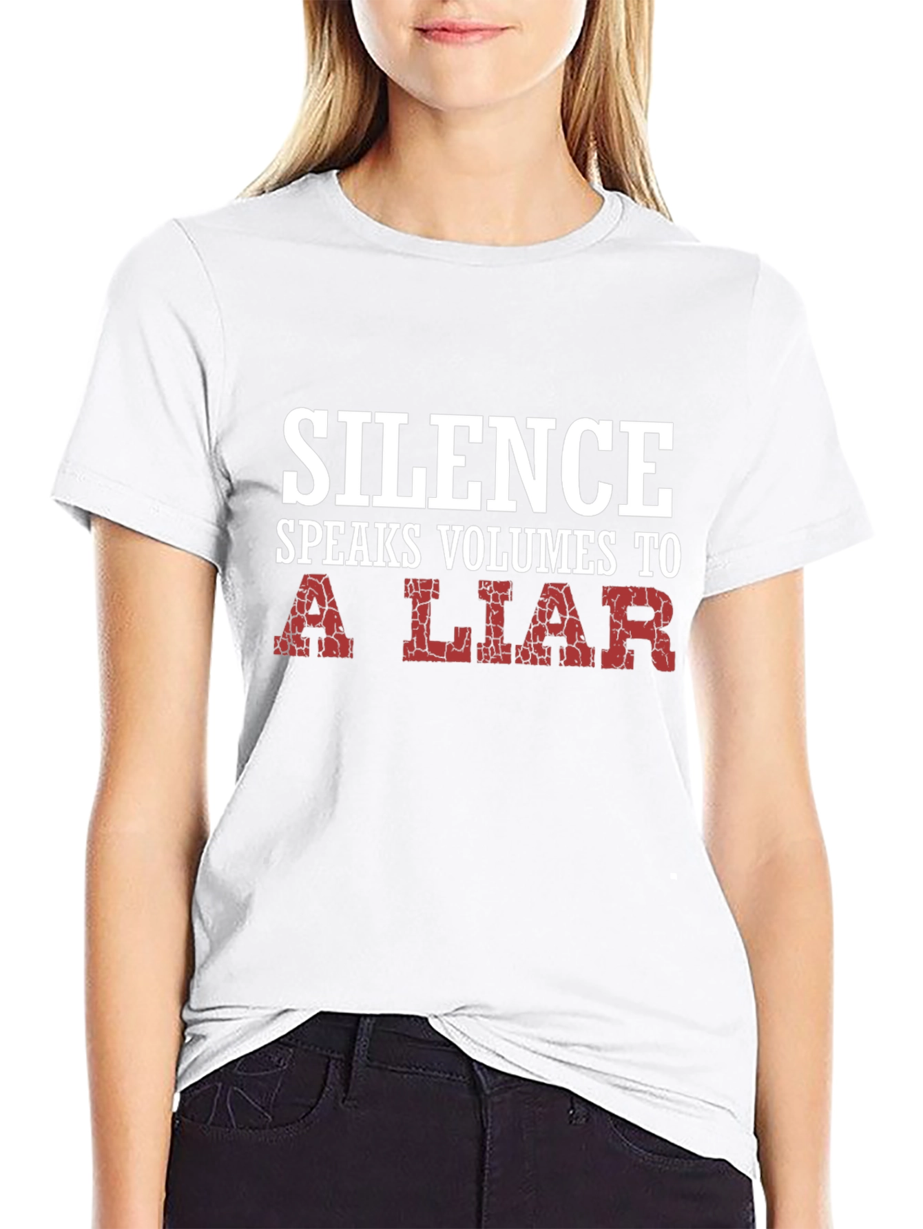 Make a statement with this bold black t-shirt. It features the impactful phrase "Silence Speaks Volumes To A Liar" in contrasting white and red lettering. The unique design and comfortable fit make it perfect for casual wear. Made from a soft, breathable fabric, this tee ensures all-day comfort. Ideal for expressing your personality and adding an edgy touch to your wardrobe. Whether you're hitting the streets or relaxing at home, this t-shirt is a must-have for those who value authenticity and aren't afraid to speak their mind.