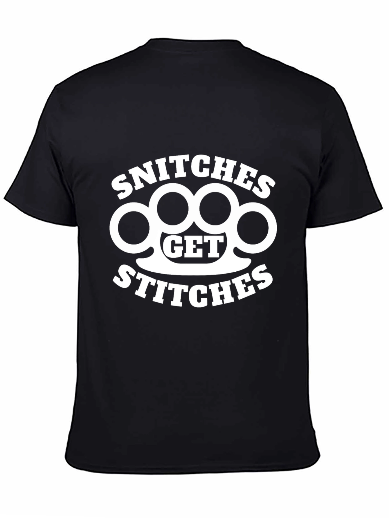 Show off your edgy style with this black t-shirt featuring a bold "Snitches Get Stitches" graphic with knuckle duster imagery. This eye-catching design makes a statement. Made from soft, breathable fabric, this tee is perfect for everyday wear, casual outings, or making a statement. The classic crew neck and short sleeves provide a comfortable and stylish fit. Stand out from the crowd with this unique and rebellious graphic tee.