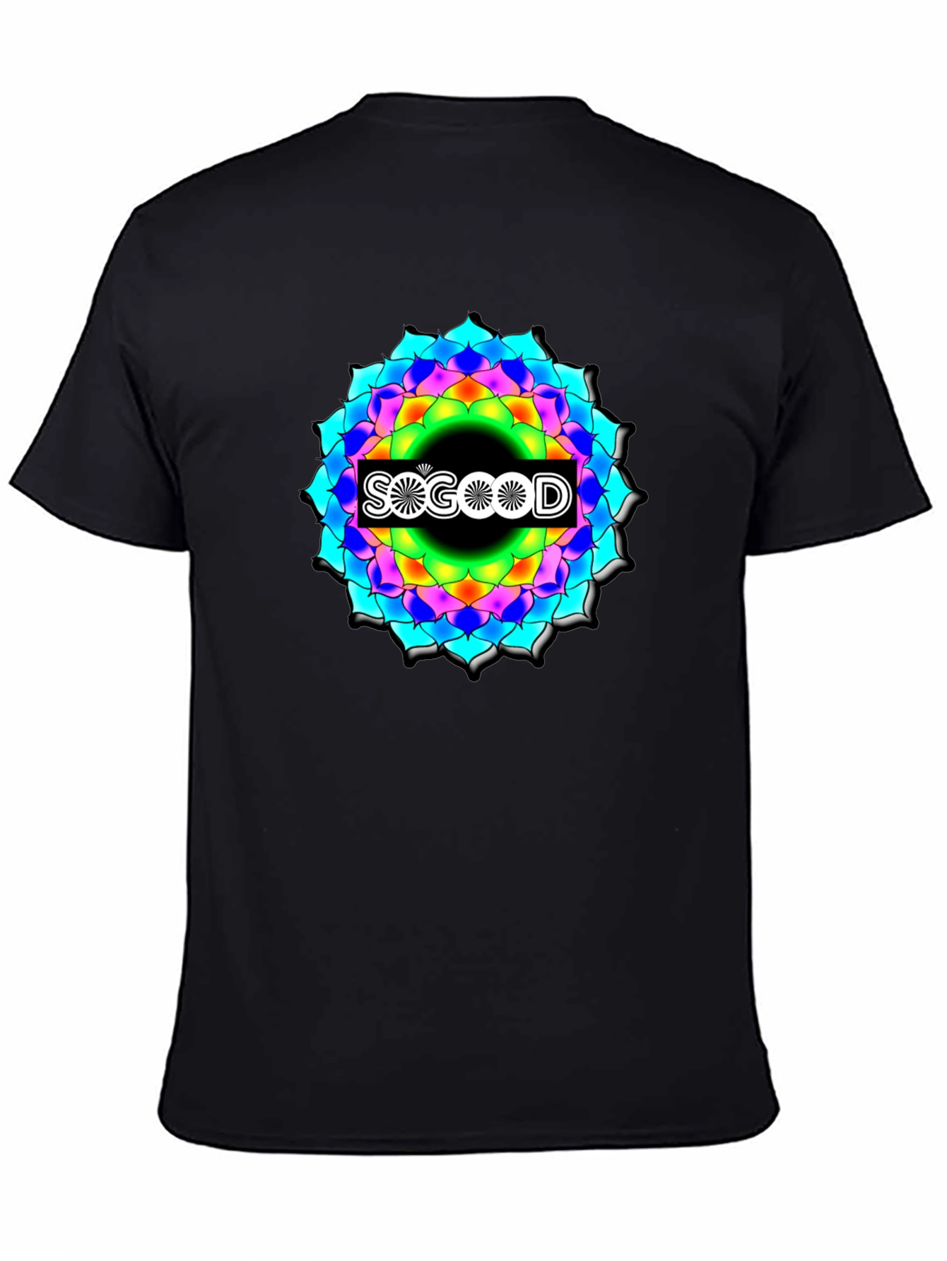 Rock a unique style with this eye-catching black t-shirt. Featuring a vibrant mandala design with a central 'So Good' graphic, this tee is sure to turn heads. The detailed mandala boasts a mesmerizing array of colors. Made from a comfortable fabric, this shirt is perfect for everyday wear. Whether you're hanging out with friends, heading to a concert, or just want to express your individuality, this 'So Good' graphic tee is a perfect choice. Add a touch of artistic flair to your wardrobe!