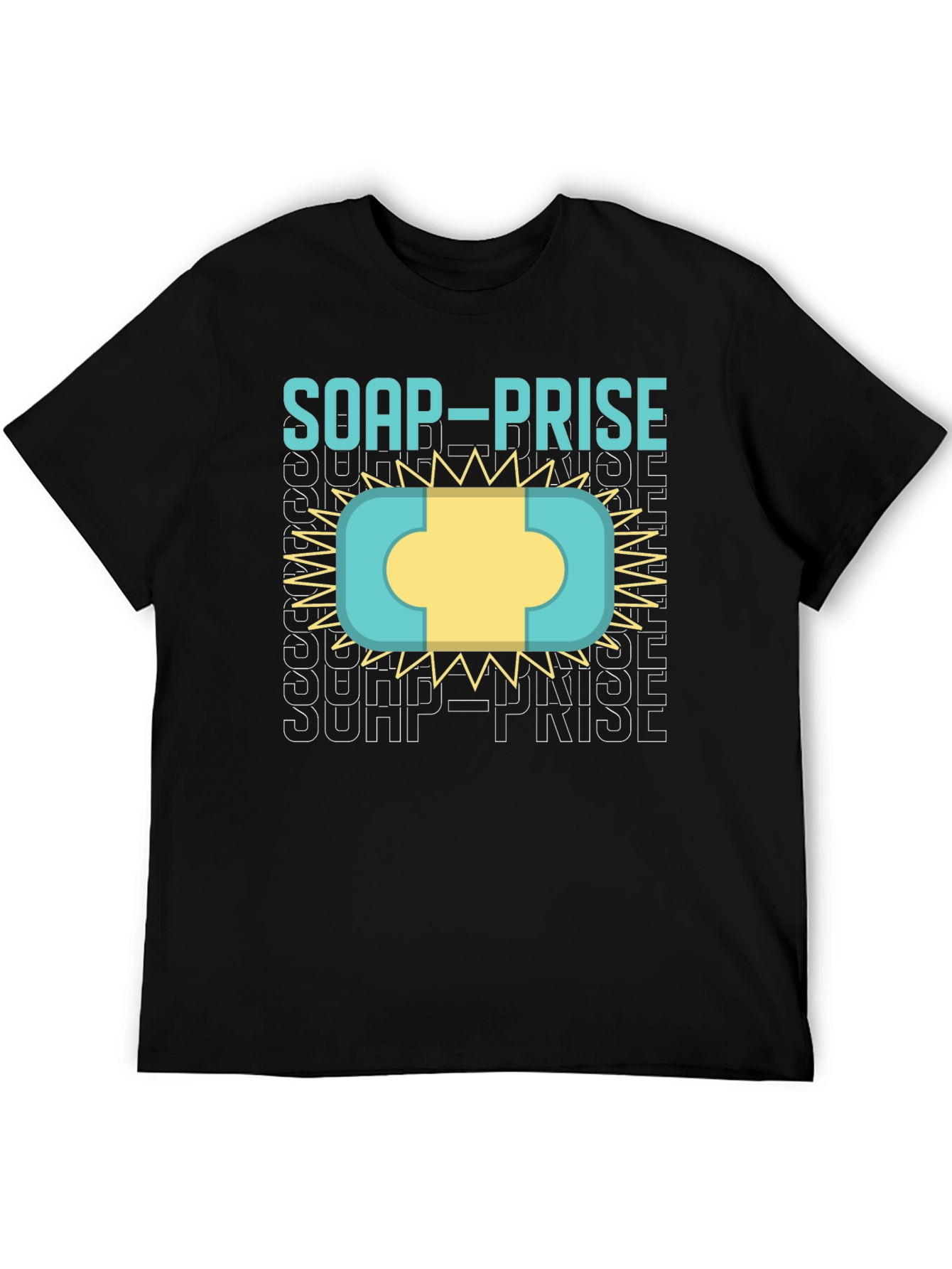 The Soap-Prise T-Shirt is a fun and quirky addition to any wardrobe. This black tee features a bold graphic design with the words 'Soap-Prise' stacked behind a unique soap bar illustration. The soap bar itself has a light blue outline with a golden yellow filling, set against a jagged white background, creating a striking visual. Made from a comfortable cotton blend, this shirt offers a relaxed fit perfect for casual wear. Whether you're running errands or hanging out with friends, this tee is sure to make a splash. It's a great conversation starter and a fun way to show off your sense of humor. Pair it with jeans, shorts, or even dress it up with a blazer for a unique style.