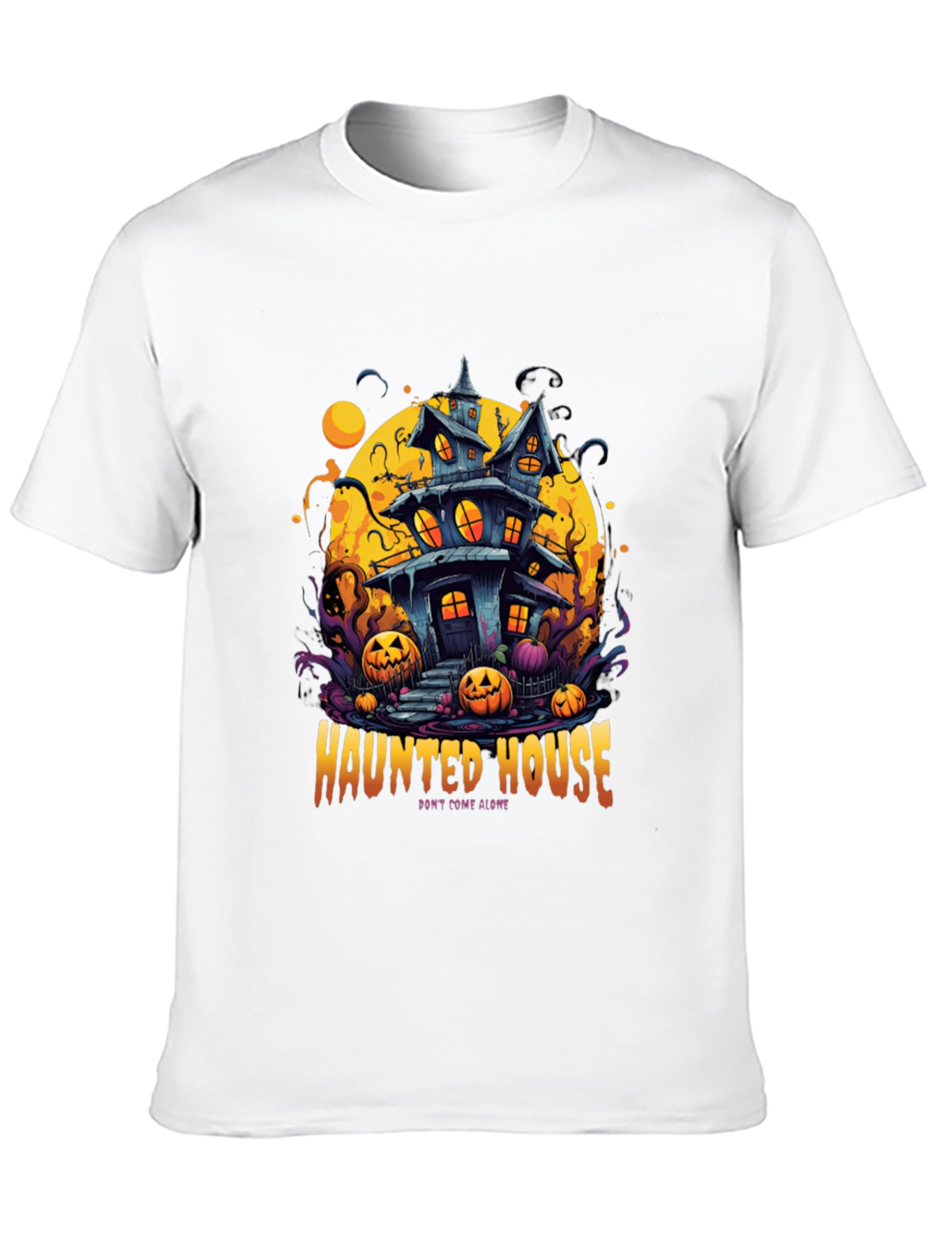 Get ready for Halloween with this spooky graphic tee! The black t-shirt features a colorful and detailed print of a haunted house, complete with pumpkins and eerie details. The vibrant artwork is set against a full moon backdrop, perfect for adding a touch of Halloween spirit to your wardrobe. Made from comfortable materials, this shirt is ideal for casual wear, Halloween parties, or trick-or-treating. Show off your love for Halloween and stand out in style with this unique tee! "Don't come alone", written below the haunted house, it reminds of the spooky season!