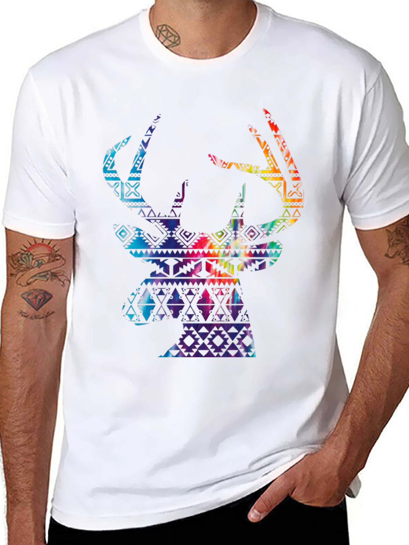 Elevate your casual style with this eye-catching men's black t-shirt. The shirt features a vibrant, multi-colored deer silhouette graphic with intricate tribal-inspired patterns. The striking design adds a unique and artistic touch to a classic wardrobe staple. Made from a comfortable-looking fabric, this tee is perfect for everyday wear, casual outings, or making a statement wherever you go. Pair it with jeans, shorts, or chinos for a relaxed yet fashionable look. This trendy tee is sure to become a favorite in your collection. Get yours today and showcase your unique style!