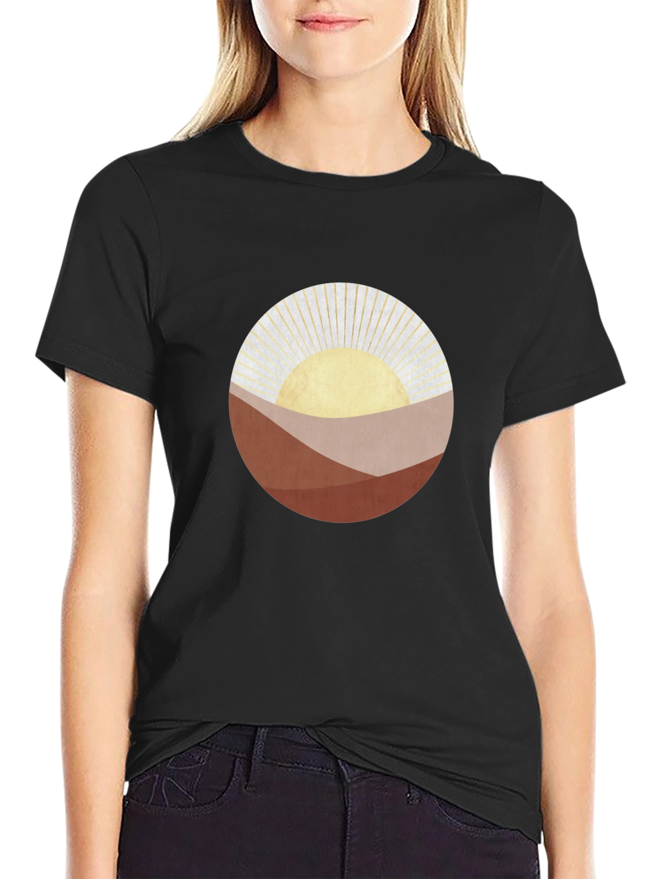 This stylish black t-shirt features a unique, circular graphic design with a modern aesthetic. The design depicts a warm, minimalist sunset scene with a soft yellow sun and earth-toned hills in shades of brown and tan. The shirt is made from a comfortable-looking fabric, perfect for everyday wear. Its simple yet eye-catching design makes it a versatile piece that can be paired with jeans, shorts, or layered under a jacket. Ideal for those who appreciate contemporary art and casual fashion. This tee is perfect for expressing your unique style.