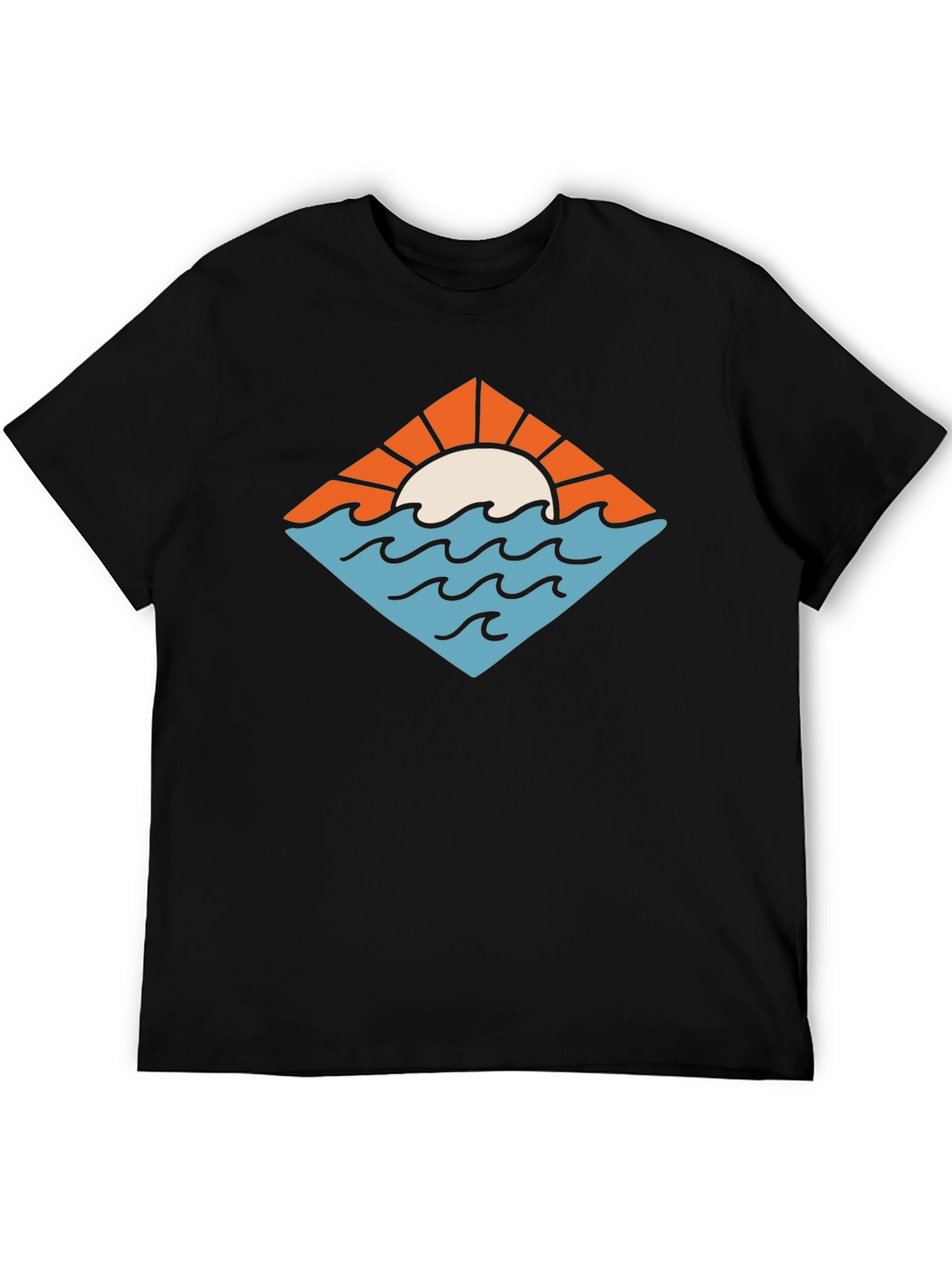 Embrace the laid-back vibes with this stylish black graphic tee. It features a unique design of a sun rising over ocean waves, all encapsulated within a diamond shape. The bold colors and clean lines create a visually appealing statement. Made from a soft, comfortable fabric, this tee is perfect for everyday wear. Dress it up with jeans or keep it casual with shorts. Whether you're hitting the beach or just hanging out, this t-shirt is a great way to add a touch of sunshine to your wardrobe. A must-have piece for anyone who loves the ocean and wants to showcase their relaxed style.