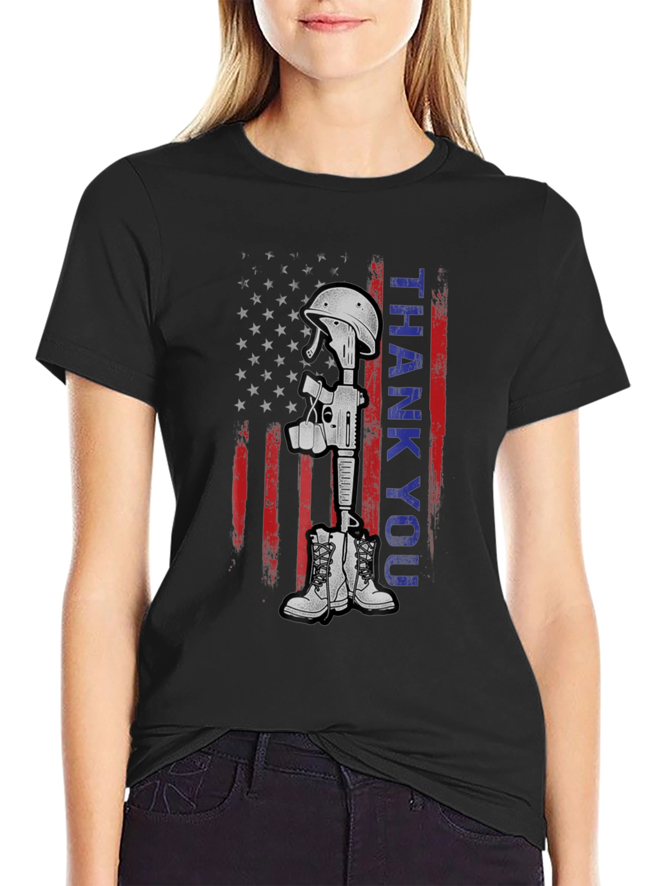 Show your appreciation with this striking black t-shirt featuring a detailed battle cross graphic. The design incorporates an American flag backdrop with bold 'THANK YOU' lettering, creating a powerful patriotic statement. The battle cross, composed of a rifle, boots, and helmet, adds a respectful touch. Made from comfortable, breathable fabric, this tee is perfect for everyday wear, memorial events, or showing support for veterans. The high-quality print ensures the design remains vibrant wash after wash. A meaningful way to honor service and sacrifice.