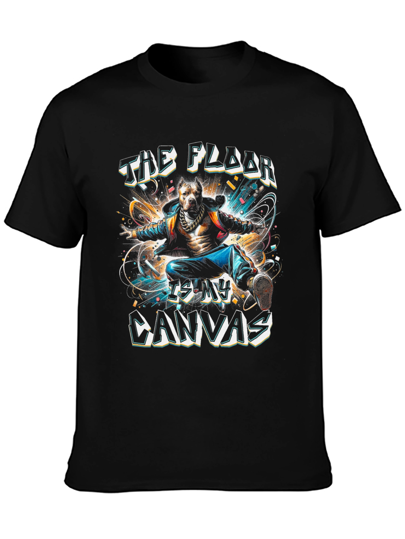 Unleash your inner artist with this unique black graphic tee! Featuring a bold design of a dog dressed in street style attire, centered amongst colorful abstract art and the statement "The Floor Is My Canvas". This tee is perfect for those who want to make a statement, whether you're hitting the streets or just chilling with friends. Its comfortable fit and eye-catching design make it a must-have for anyone who appreciates unique and expressive clothing. Made of soft, breathable material. Style meets self-expression in this one-of-a-kind garment!