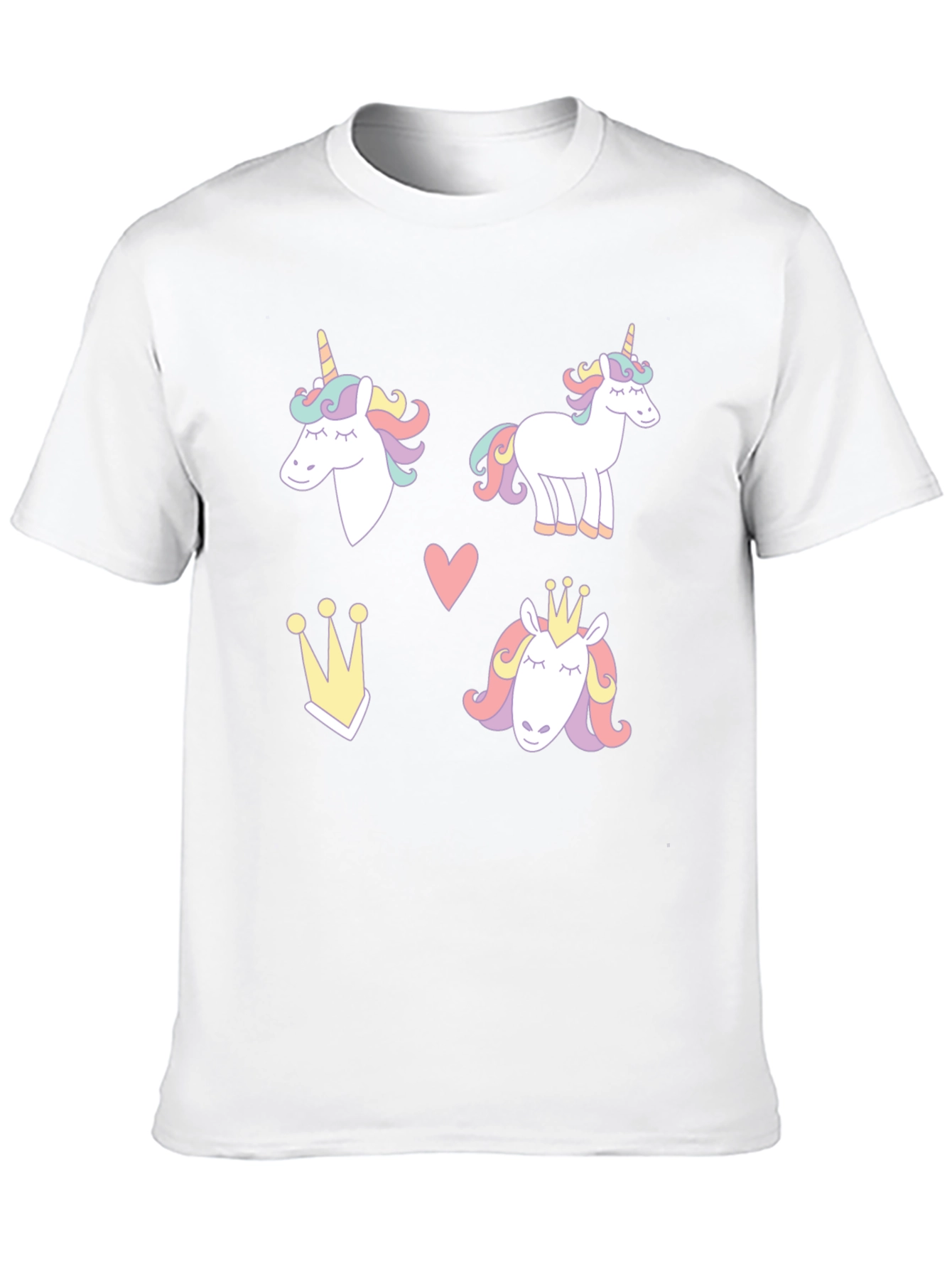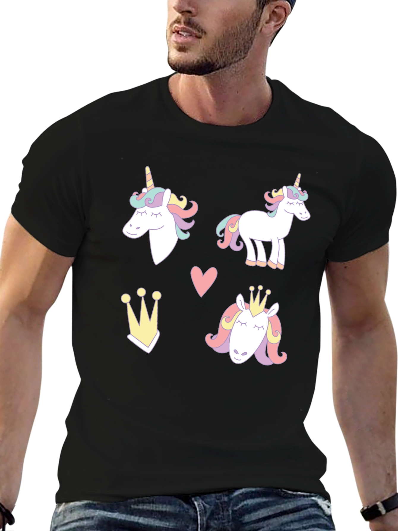 This black t-shirt features a charming and whimsical unicorn-themed design. The shirt showcases several adorable unicorn illustrations, a delicate pink heart, and a crown, creating a playful and magical aesthetic. Made from a soft-looking fabric, this tee appears to be comfortable and durable. Perfect for casual wear, this t-shirt would be a great addition to any wardrobe. It's ideal for expressing a fun-loving personality or simply enjoying a relaxed and stylish look. The unique design will surely turn heads and spark conversations wherever you go.