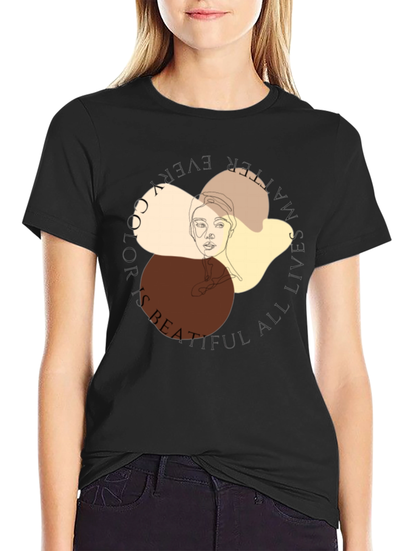 Elevate your wardrobe with this unique black t-shirt. It features a minimalist line art design of a woman's face, surrounded by abstract shapes in neutral tones of brown, tan, and cream. The circular design is adorned with text. This soft and comfortable tee is perfect for casual wear, making a subtle yet stylish statement. Pair it with your favorite jeans or shorts for an effortless, on-trend look. A versatile addition to any collection, expressing artistic flair.