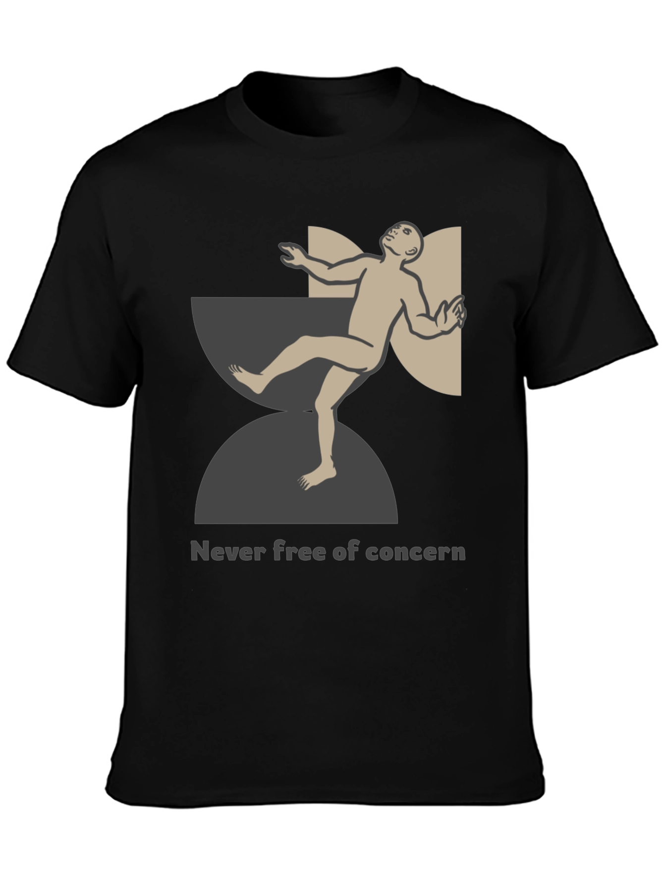 This stylish black t-shirt features a unique and thought-provoking graphic design. The eye-catching image incorporates semi-circular shapes with a nude figure in an off-balance position, accompanied by the phrase "Never free of concern." Crafted from a comfortable-looking fabric, this tee offers both style and comfort. Ideal for casual wear, this statement piece adds a touch of artistic flair to any outfit. Show off your individual style and spark conversations with this unique and expressive t-shirt. Perfect for those who appreciate distinctive designs and meaningful messages.