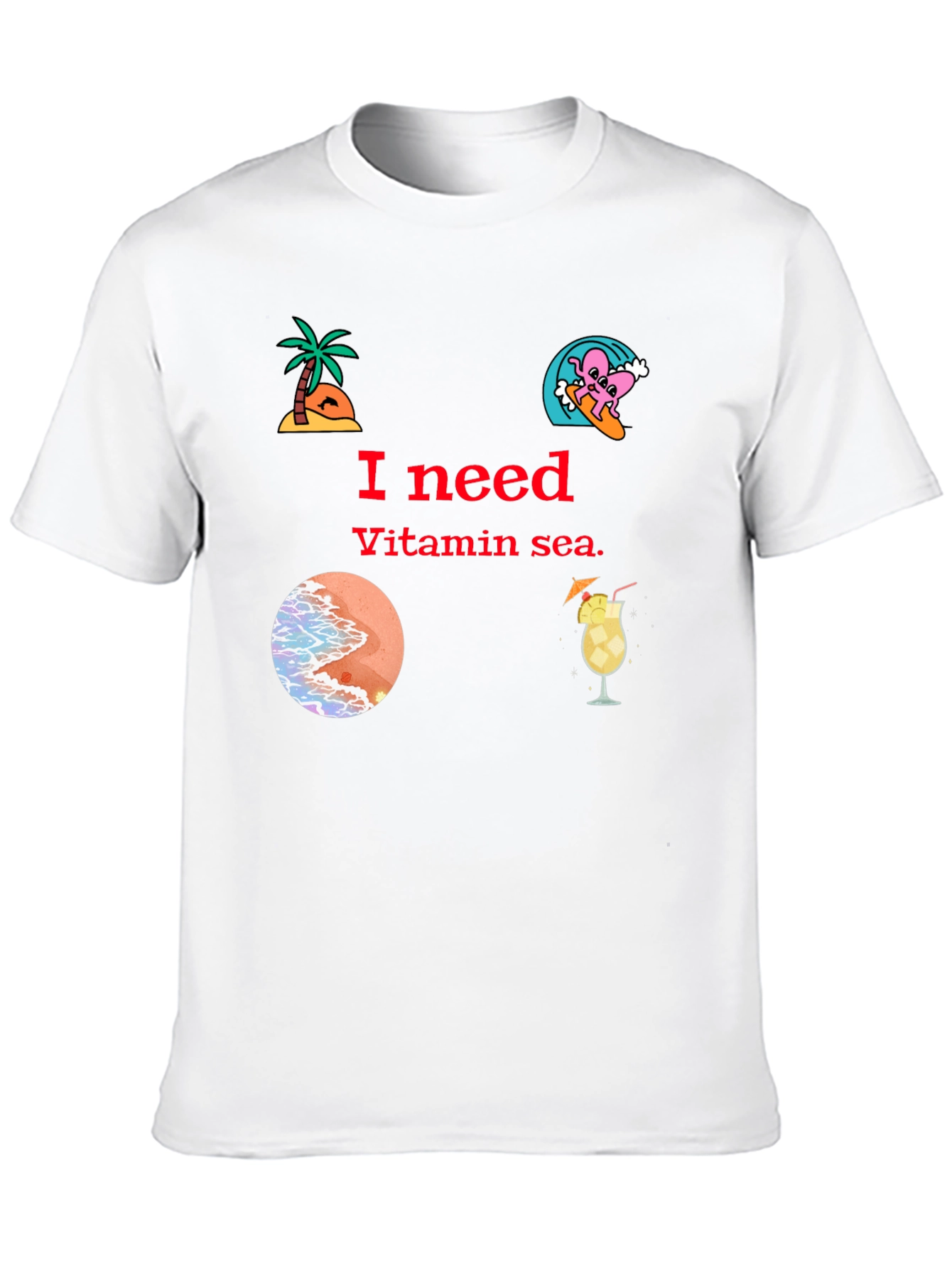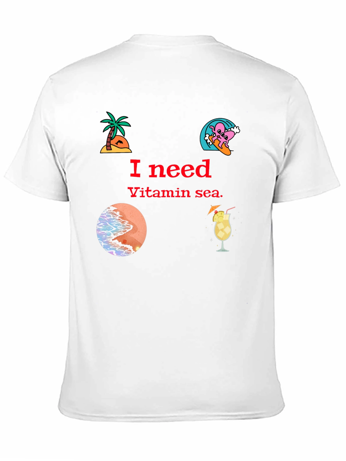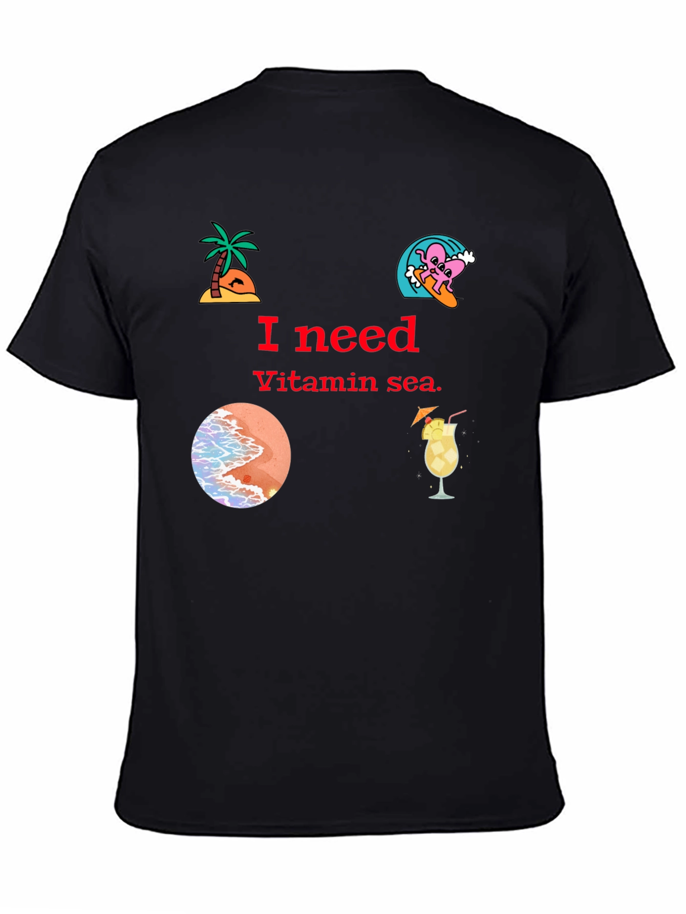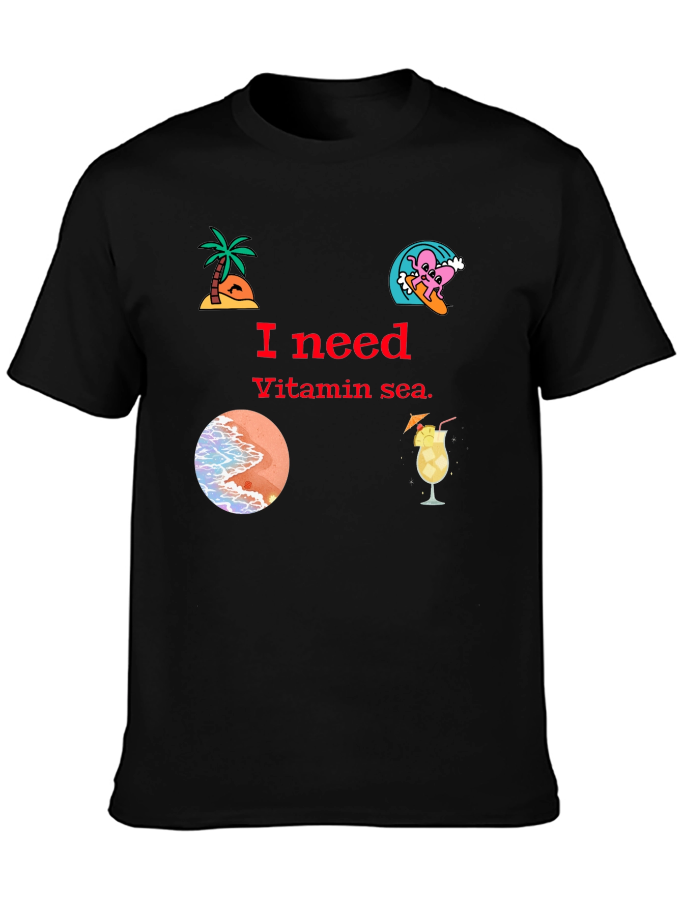 Embrace the beach vibes with this black t-shirt featuring a fun and playful design! The shirt showcases vibrant graphics including a palm tree on an island, a surfing octopus, a beach scene within a circle, and a refreshing cocktail. The text "I need Vitamin sea" adds a touch of humor and perfectly captures the essence of summer. Made from comfortable, breathable fabric, this tee is perfect for casual wear, beach outings, or vacation adventures. Show off your love for the ocean with this unique and eye-catching t-shirt!