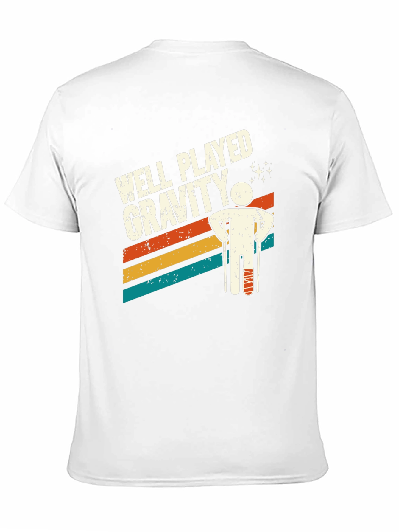 This black t-shirt features a humorous and relatable design for anyone who's ever had a run-in with gravity. The graphic showcases the phrase "Well Played Gravity" in a vintage distressed font, along with a stylized stick figure on crutches, all set against retro-inspired stripes. Made from what appears to be a soft, comfortable cotton blend, this tee is perfect for casual wear, lounging, or as a funny gift for someone recovering from an injury. Show off your sense of humor and resilience with this unique tee!