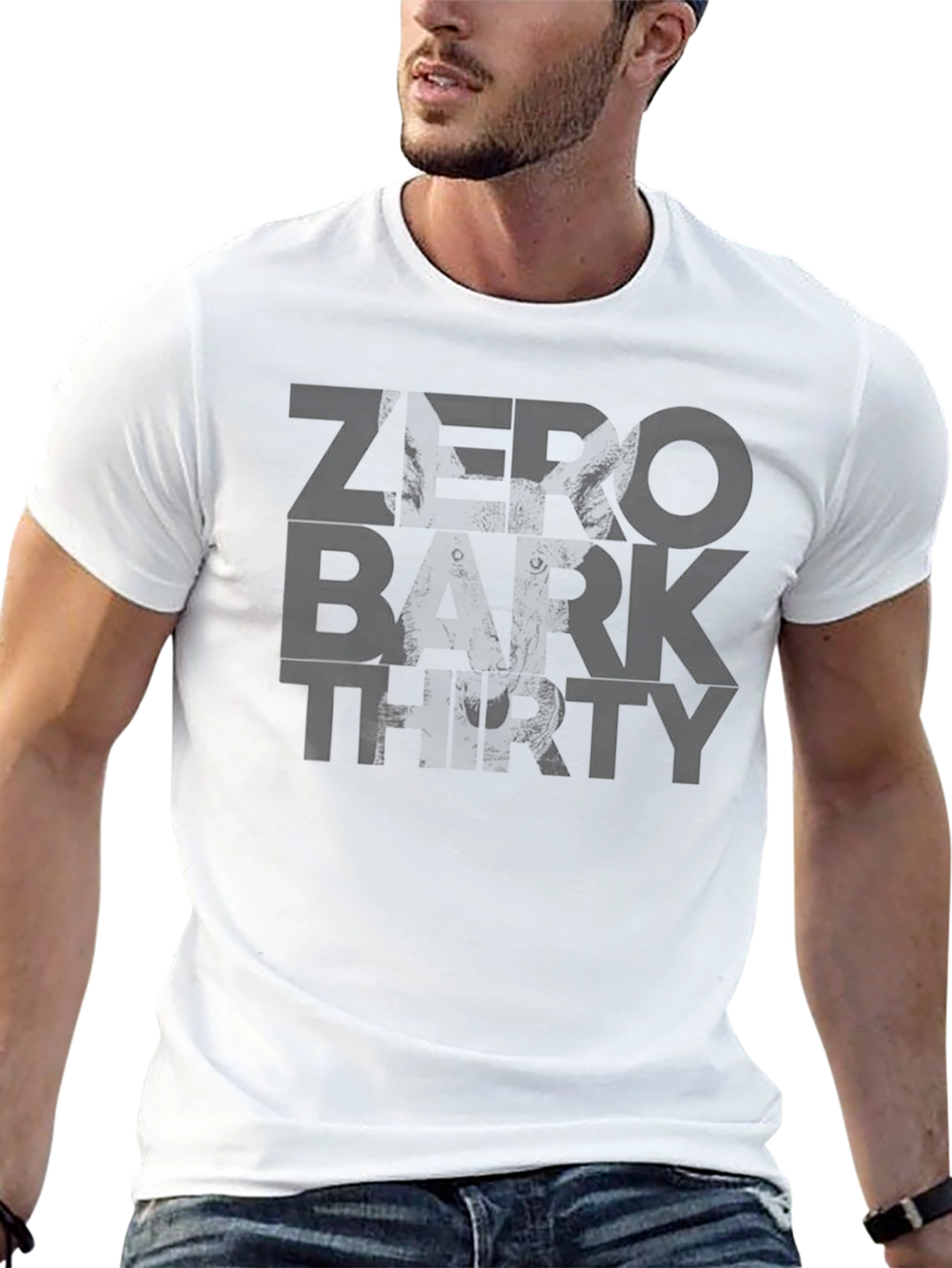 This stylish men's black t-shirt features a bold, graphic print that reads "Zero Bark Thirty". The shirt appears to be made from a soft, comfortable material, likely cotton or a cotton blend. Its classic crew neck and short sleeves make it perfect for everyday wear. The design adds a touch of humor and individuality to your wardrobe. Wear it casually with jeans or dress it up with a jacket for a night out. This versatile t-shirt is a must-have for any modern man.